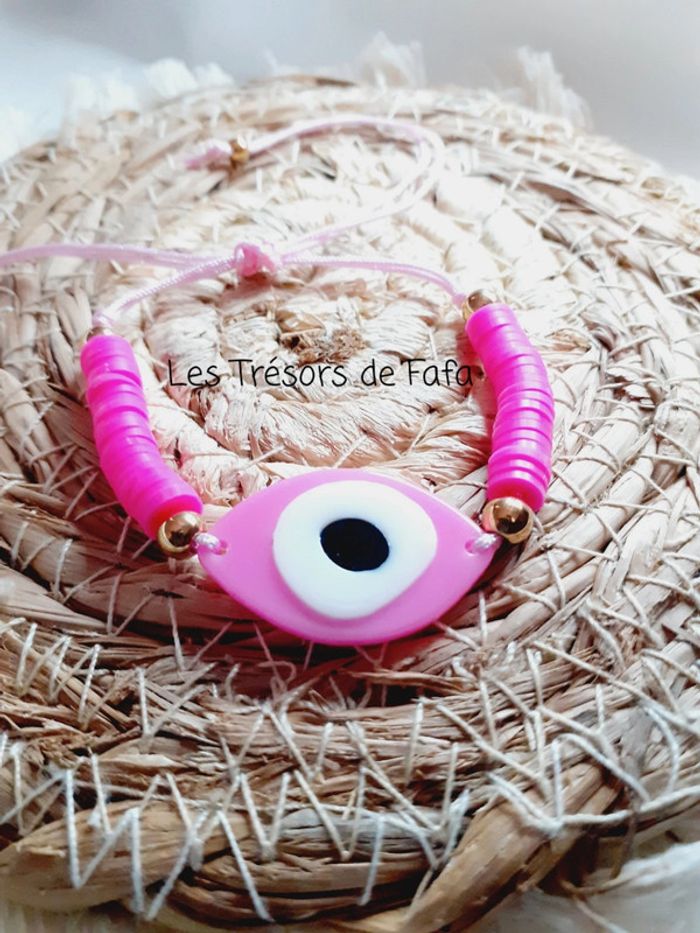 🌸 Bracelet rose connecteur oeil rose. 🌸 Perles dorées en acier inoxydable. 🌸 Perles heishi en argile polymère rose. 🌸 Diamètre connecteur : environ 3 cm. #fatima09876543bracelet
