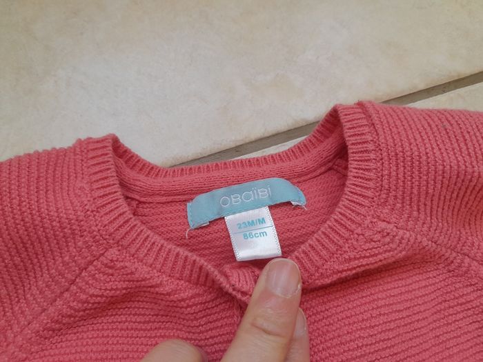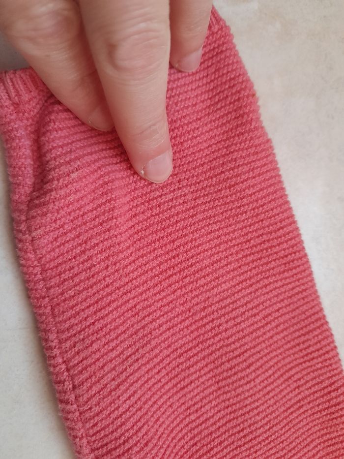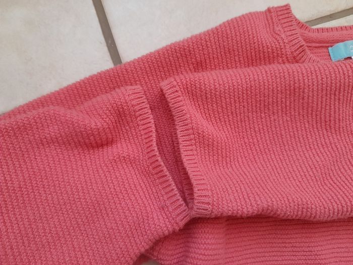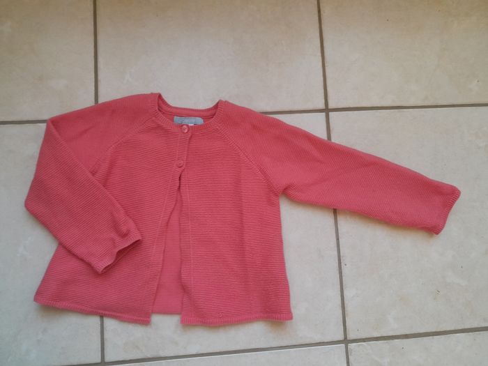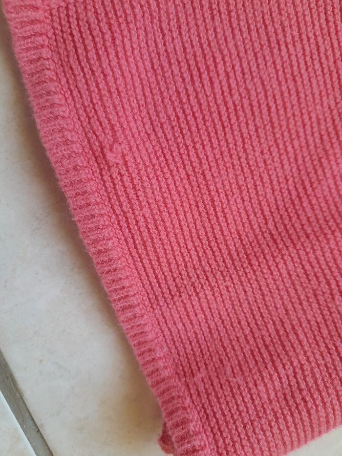Gilet couleur corail, s'attache avec 2 boutons. Une petite tâche tout juste visible et un petit accro sur le bas du gilet (voir photos)
