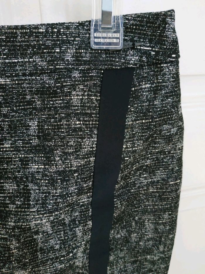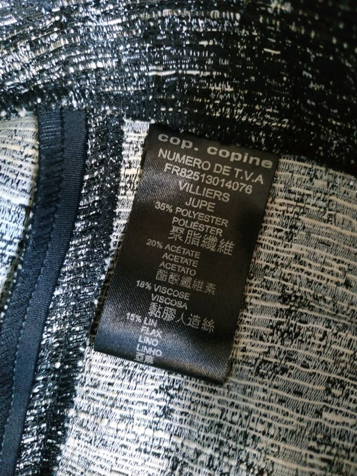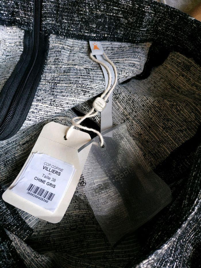 Jupe COP COPINE Taille 38. Neuve et étiquetée. Gris chiné avec bandes noires à l'avant et à l'arrière. Modèle : VILLIERS. Composition : 35% polyester, 20% acétate, 18% viscose, 15% lin, 12% coton.