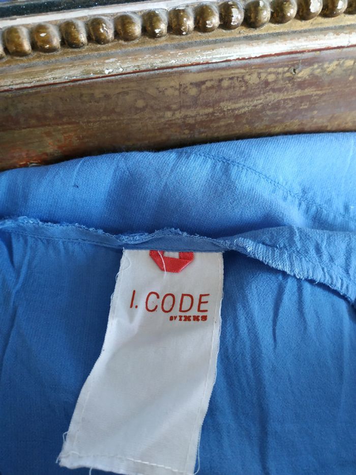 Blouse bleue ciel ICODE. Taille S. Excellent état, comme neuve ! Fluide et légère. Petite plaque de la marque en bas de la blouse. NB : avant la mise en vente ainsi qu'avant l'envoi de l'article, l'état de ce dernier est scrupuleusement vérifié, afin qu'il n'y ait aucune mauvaise surprise lors de la réception. J'attache une réelle importance à indiquer le véritable état de l'article car il n'y a rien de plus décevant que de recevoir un article qui ne correspond pas à la description qui en est faite.. et c'est malheureusement très souvent le cas sur l'application. Vous pouvez acheter en toute confiance, vous ne serez pas déçue.