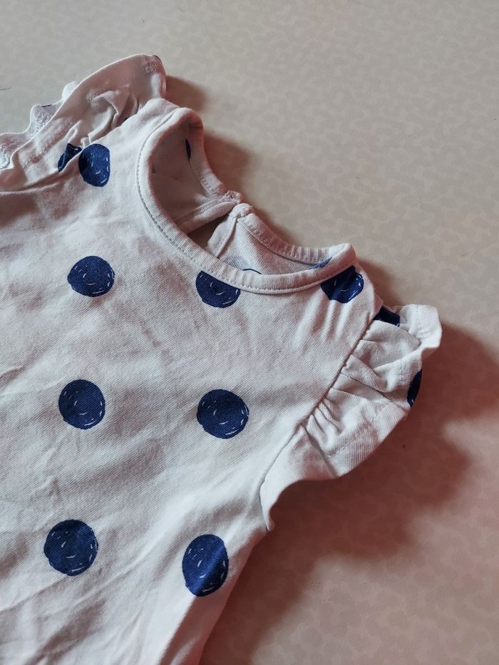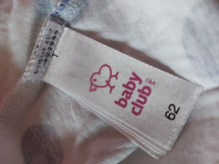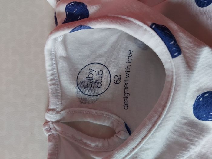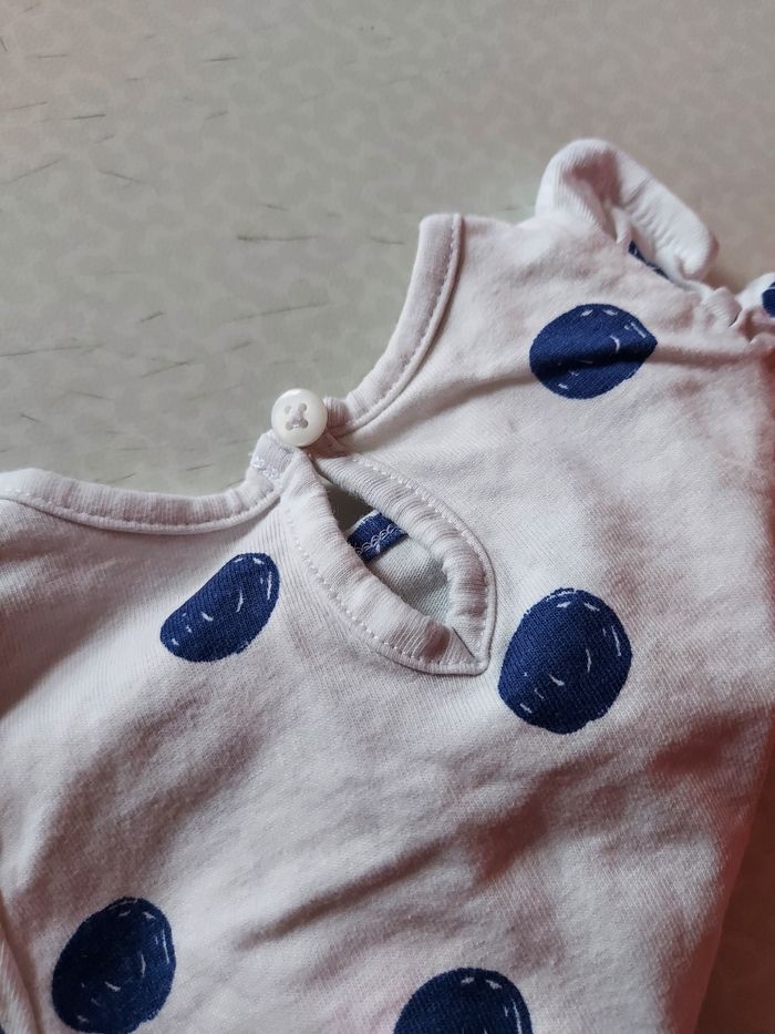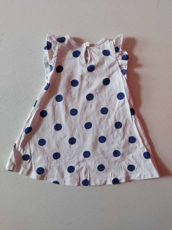 Je vends une robe banche à gros pois de couleur bleu marine venant de chez C&A, détails sur les manches et boutons dans le dos pour facilité le passage de la tête. Taille 62, neuve jamais mise.
