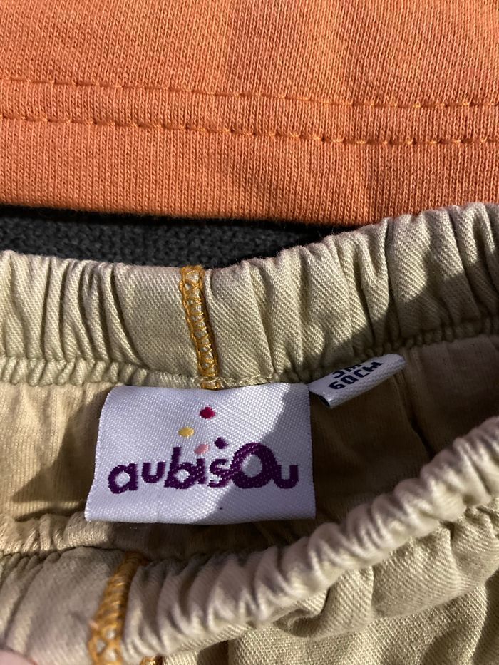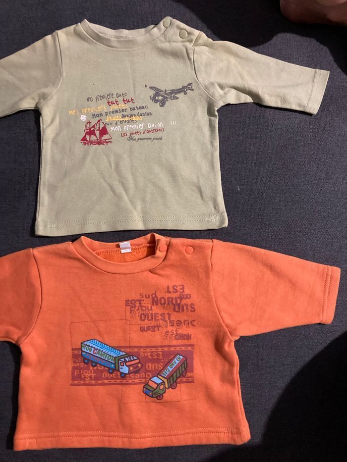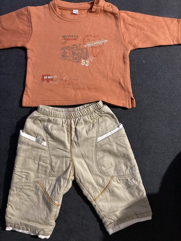 2 sweat shirt orange (tout doux à l’intérieur) 1 t.shirt vert Tous les 3 ont des boutons au col pour passer facilement la tête de bébé. 1 pantalon doublé aubisou Les 4 articles ont été peu portés. (FlopacaBoîte3moiscarree) Envoi via mondial Relay, relais colis ou chronopost : les 3 types de transports sont disponibles près de chez moi.