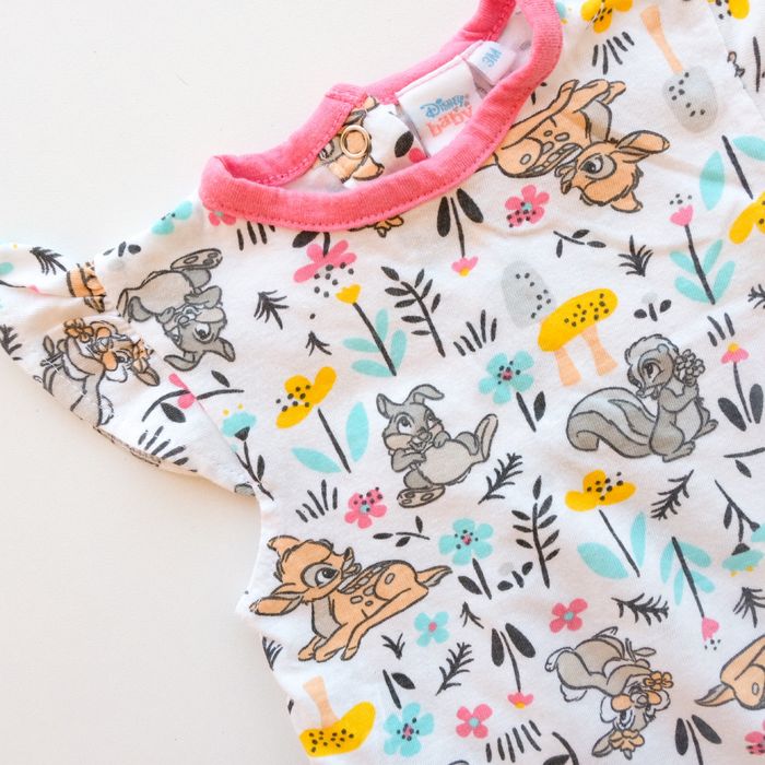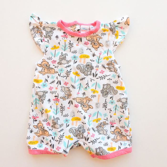 Barboteuse à manches courtes volantées, en coton. Imprimé thème Bambi all over. Excellent état