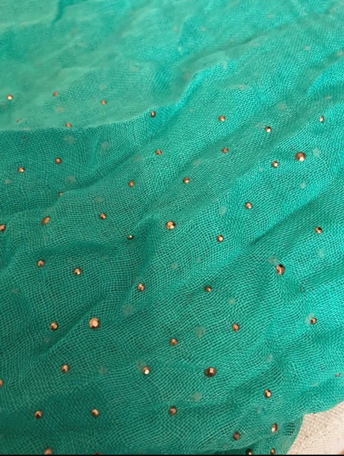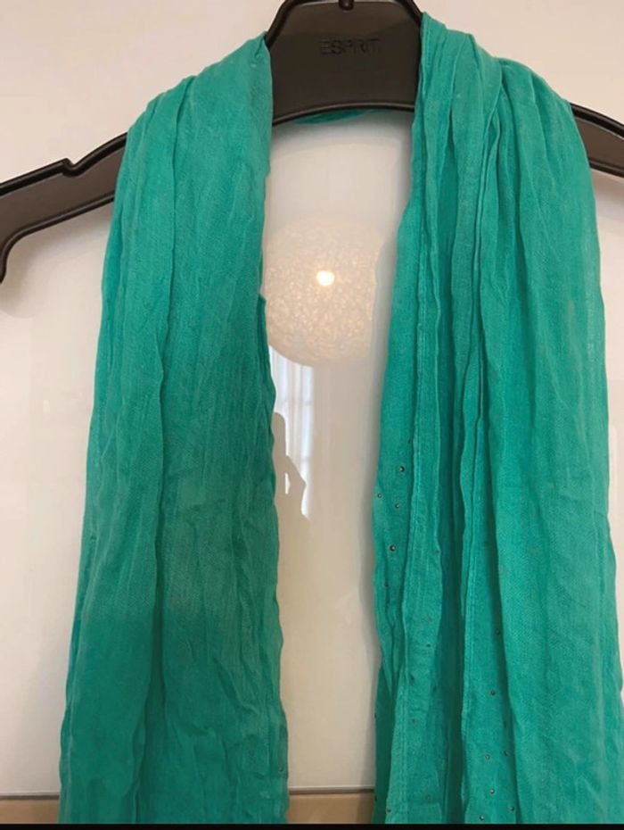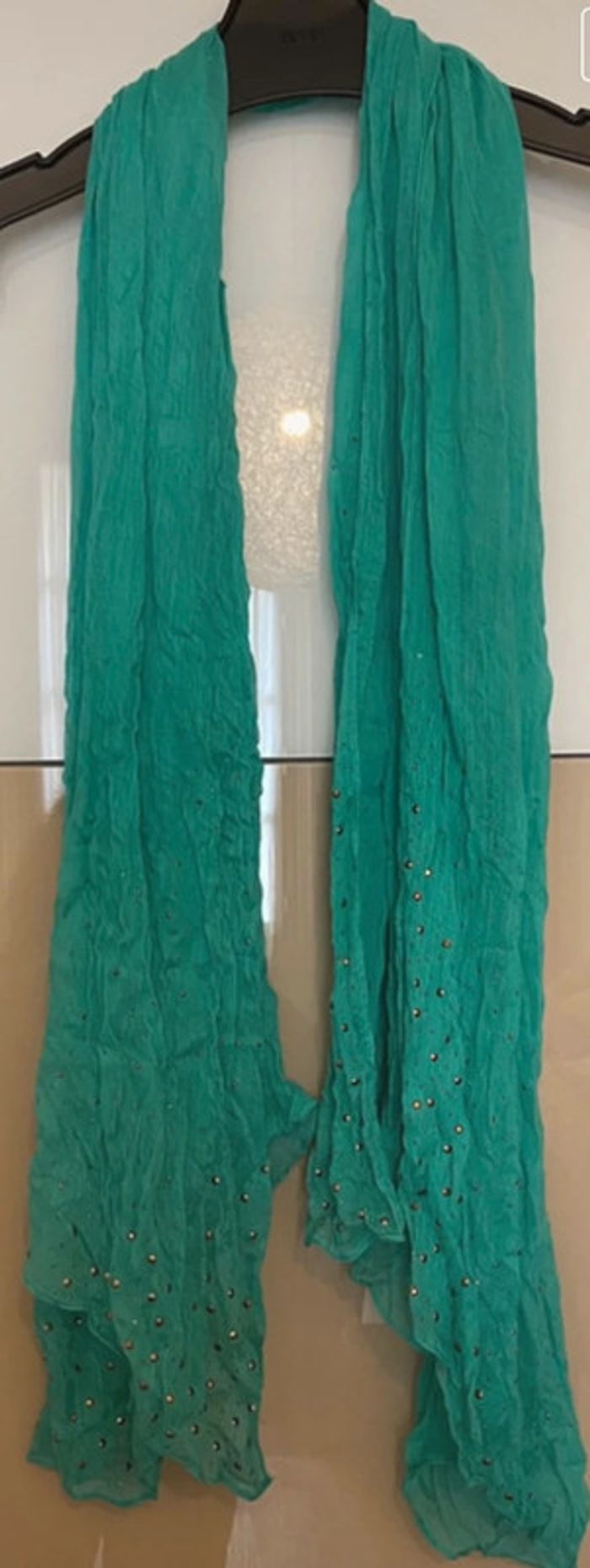 écharpe douce et légère. Couleur vert d’eau avec jolis strass dorés aux 2 extrémités de l’étole. Longueur 180 Cm Largueur 120 cm Zéro accros