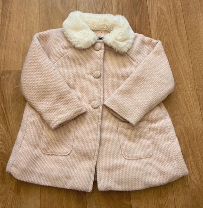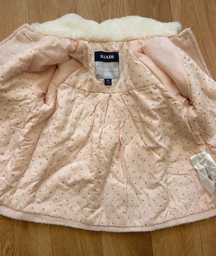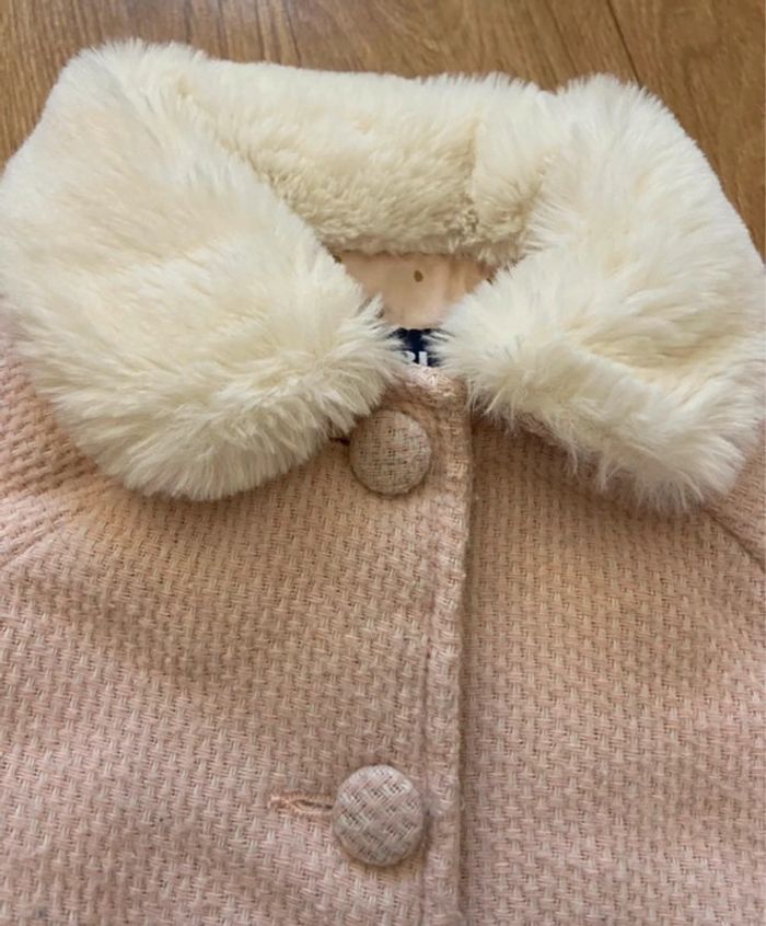 manteau rose pâle avec petite moumoute au niveau du col de la marque Kiabi Taille 18 mois Fermeture 3 boutons Très bon état