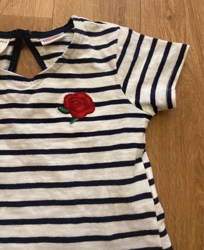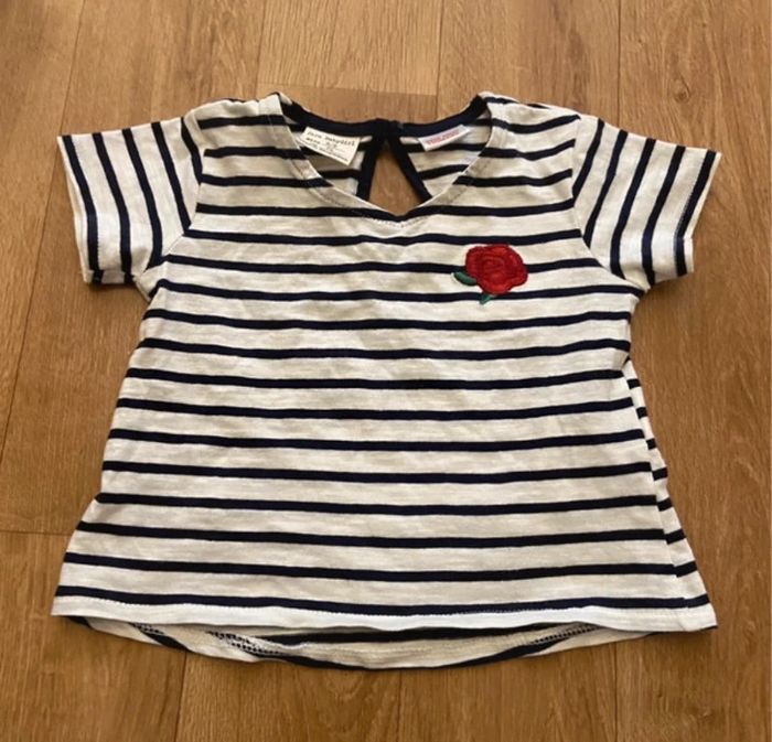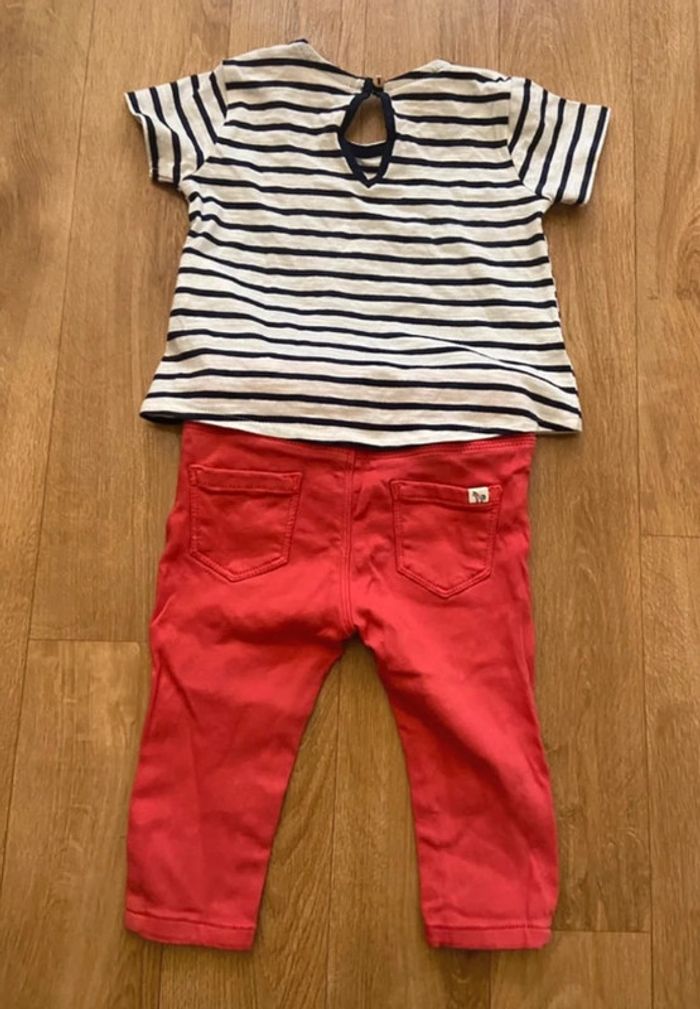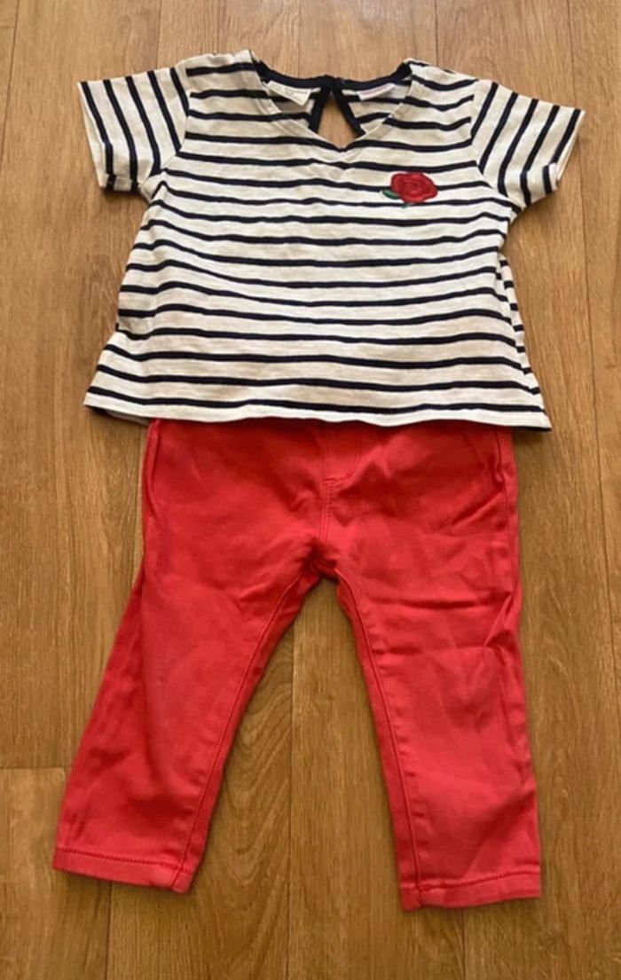 Je vends cet ensemble t-shirt marinière et jean rouge mixte 6-9 mois