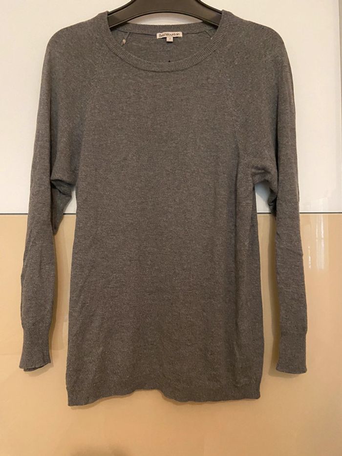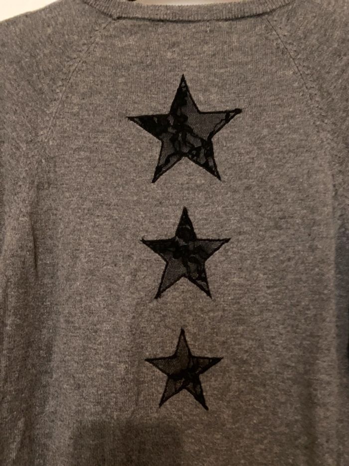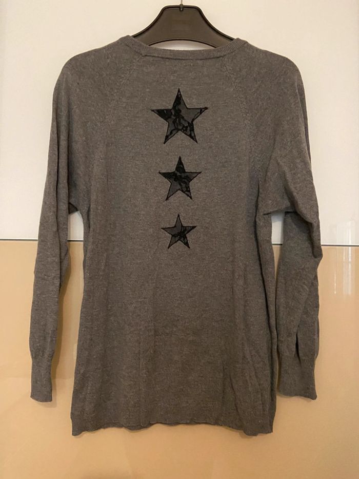 Je vends ce pull long gris avec étoiles dentelles au niveau du dos 37%viscose 30% coton 23% laine 10% polyamide