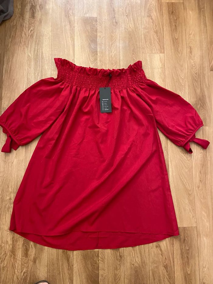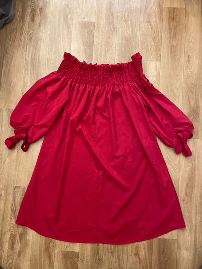 Je vends cette robe ample bustier Rouge Manches 3/4 avec noeuds 95% polyester 5% spandex Neuve
