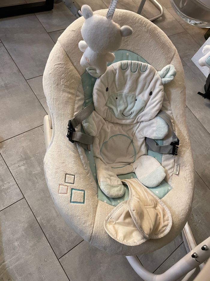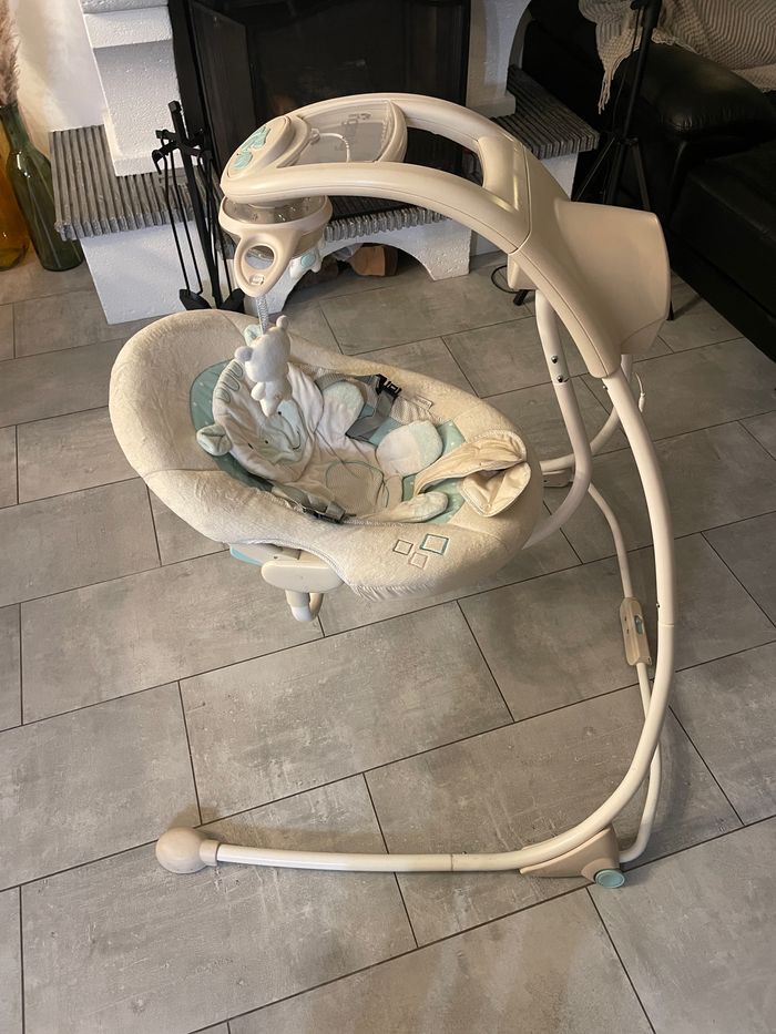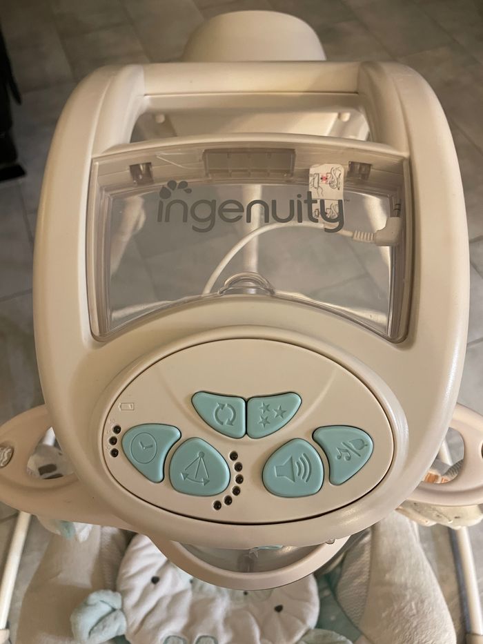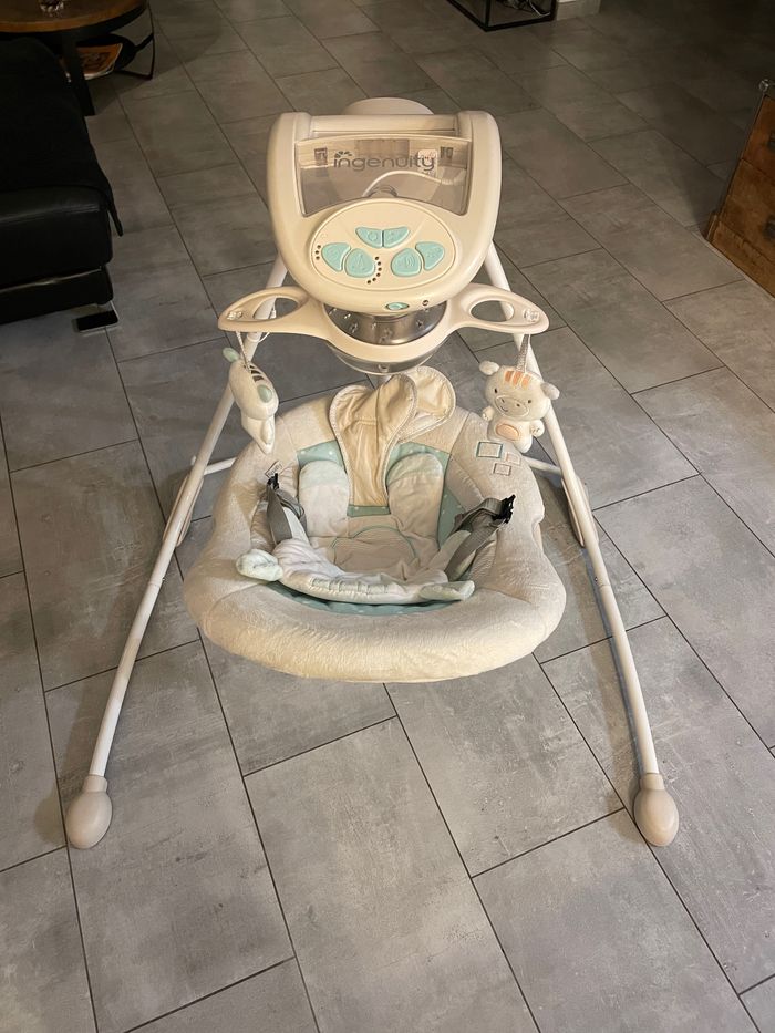 Vends balancelle Ingenuity son et lumière en parfait état Le mobile tourne, la balancelle balance et il y a un emplacement pour brancher le téléphone en haut pour mettre de la musique. Fonctionne sur secteur Mesures: Hauteur : 101cm Largeur du pied : 95x87cm