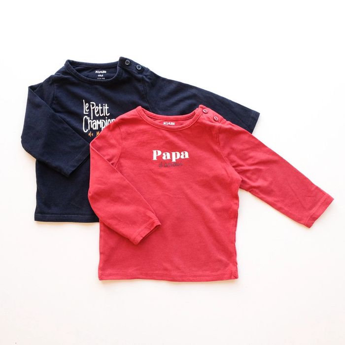 Lot de 2 t-shirt à manches longues : un bleu marine "Le petit champion de maman" et un bordeaux "papa d'amour". Excellent état ✨vous souhaitez créer un lot, contactez-moi ! #9moisencorejoli