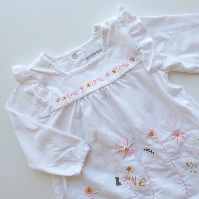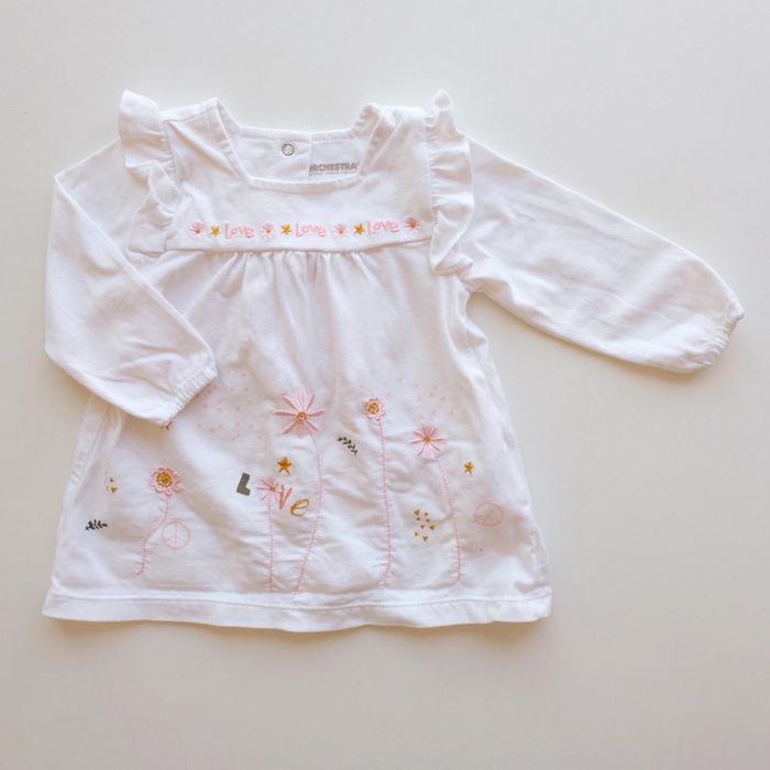 Robe à manches longues, coloris blanc, en coton. Petites broderies fleurs roses. Petits volants au niveau des épaules. Boutons pressions en haut du dos. Excellent état ✨vous souhaitez créer un lot, contactez-moi ! #9moisencorejoli