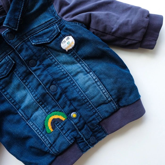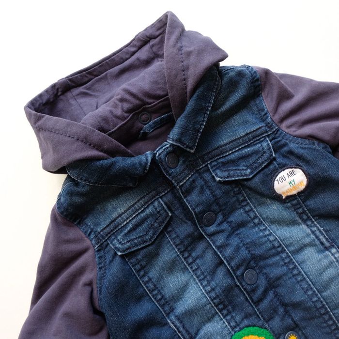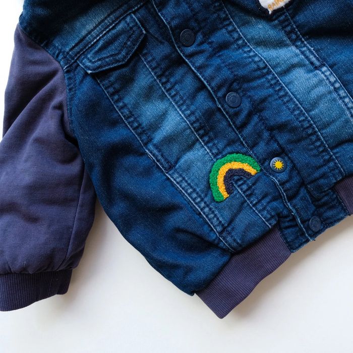Veste bi-matière et denim et coton, coloris bleu brut et bleu marine. Capuche amovible. Fermeture par pressions sur le devant. Très chouette. Excellent état ✨vous souhaitez créer un lot, contactez-moi ! #9moisencorejoli