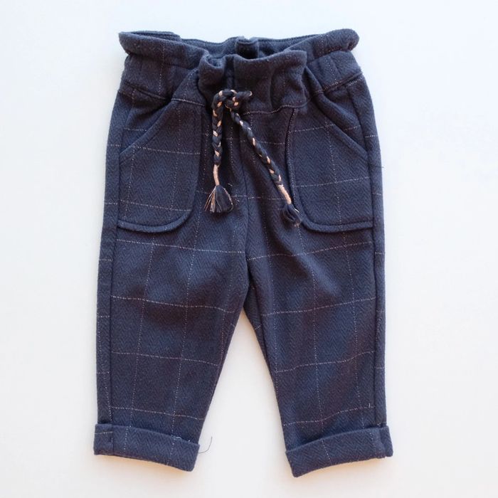 Pantalon souple, coupe esprit paper bag. Coloris bleu marine et fils métallisés cuivrés. Cordon à nouer au niveau de la taille élastique. Très chouette et confortable pour bébé. Excellent état ✨vous souhaitez créer un lot contactez-moi ! #6moisencorejoli