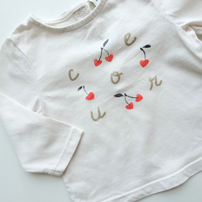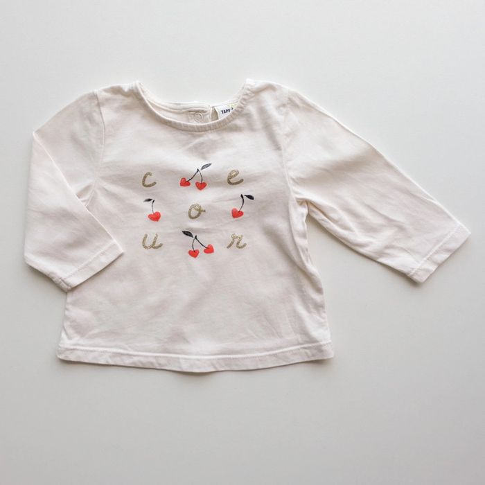 T-shirt à manches longues coloris blanc, motifs cerises-coeurs sur le devant. Boutonnière à pressions en haut du dos. Très bon état ✨vous souhaitez créer un lot, contactez-moi ! #3moisencorejoli