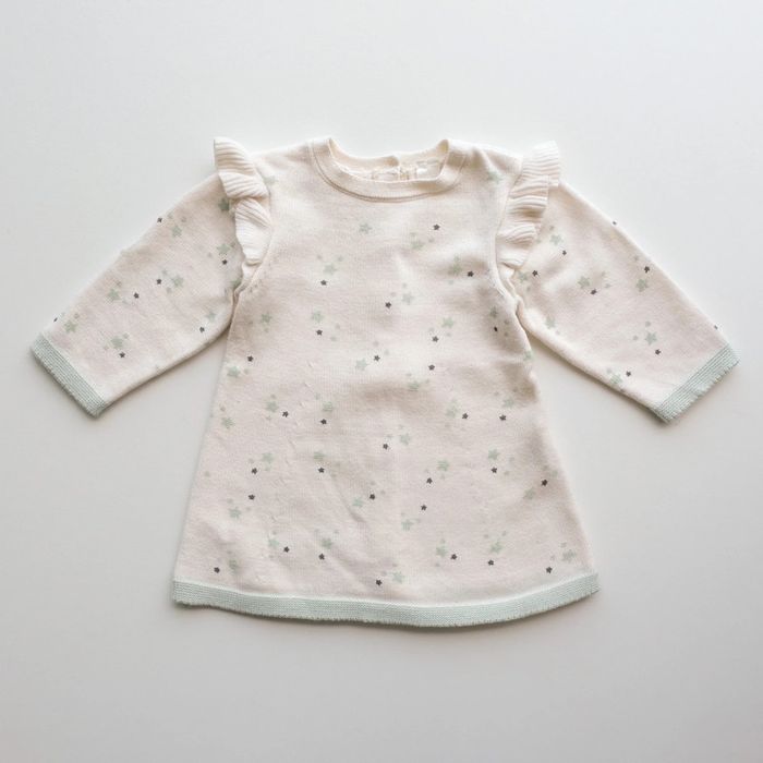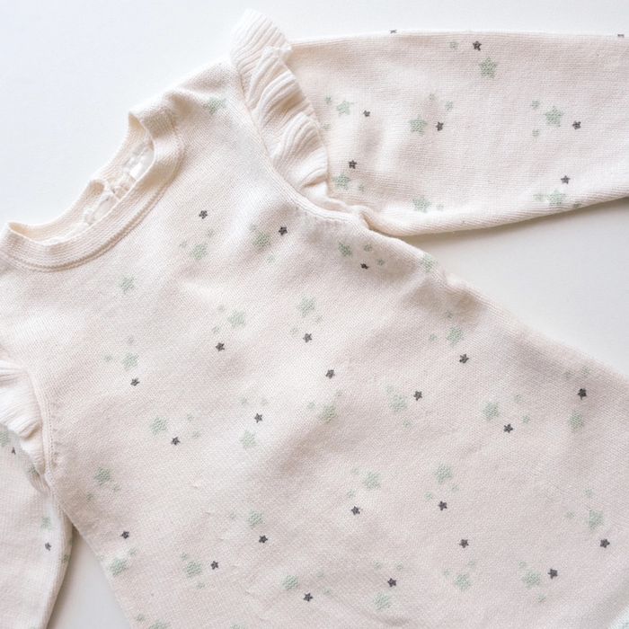 Robe-pull à manches longues, coloris blanc cassé, motifs étoiles coloris vert d'eau all over. Petits volants au niveau des épaules. Neuf sans étiquette ✨vous souhaitez créer un lot, contactez-moi ! #3moisencorejoli
