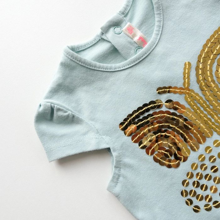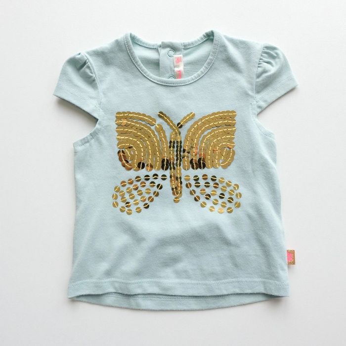 T-shirt à manches courtes, coloris bleu, papillon en sequins dorés sur le devant. Boutons pressions en haut du dos. Excellent état ✨vous souhaitez créer un lot, contactez-moi ! #12moisencorejoli
