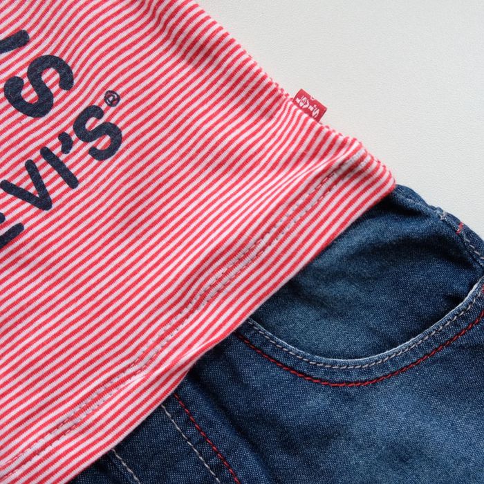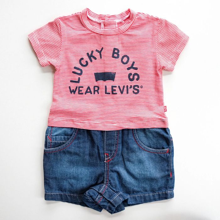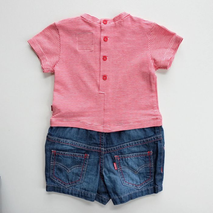 barboteuse, combicourt en trompe l’oeil de la marque Levi’s top rayé rouge et blanc et short en denim bleu. pressions à l’entrejambe et au dos. 6 mois en très bon état ✨encore plus de jolis trésors sur la boutique en ligne encorejoli.com / insta @encore_joli ✨vous souhaitez créer un lot, contactez-moi !