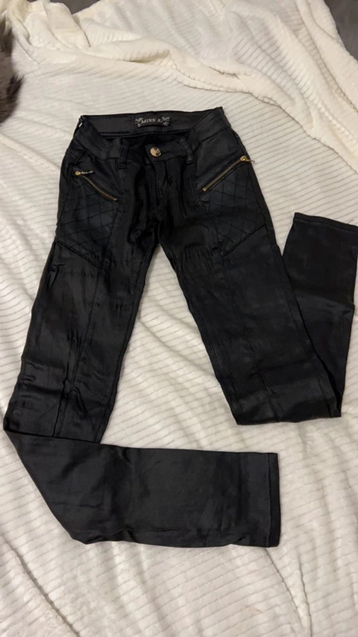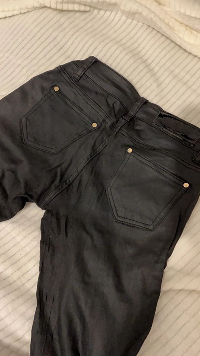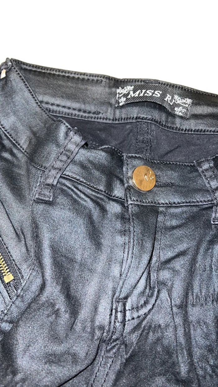 Jeans noir effet cuir ou huilé 34/36 Taille basse 18cm Jambe 83cm Chevilles 12cm Tbe