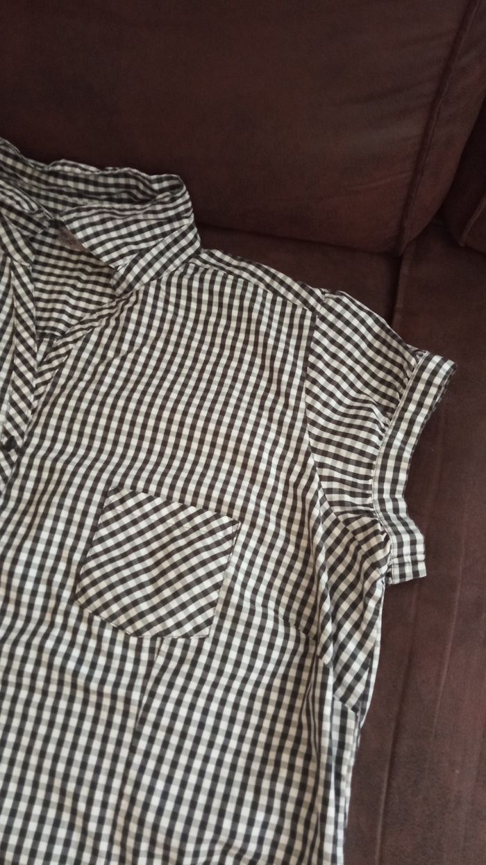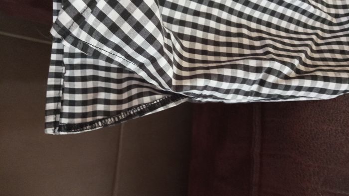Ravissant Chemisier T56 "Ikébana" Couleur: Noir et Blanc à carreaux Forme habillée, Style classe Sans épaulettes, Manches courtes Fermé devant par petits boutons Fendu de chaque côté dans le bas Dimensions: Longueur 76cm - épaule à épaule 46,5cm - aisselles à aisselles 68cm Matière: 27% Polyester + 68% Coton + 5% Élasthanne Chemisier en parfait état