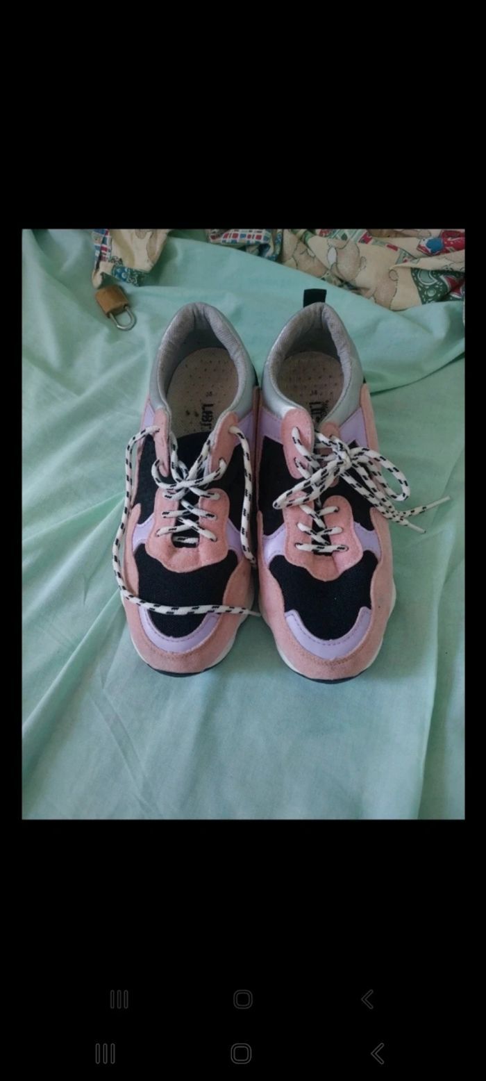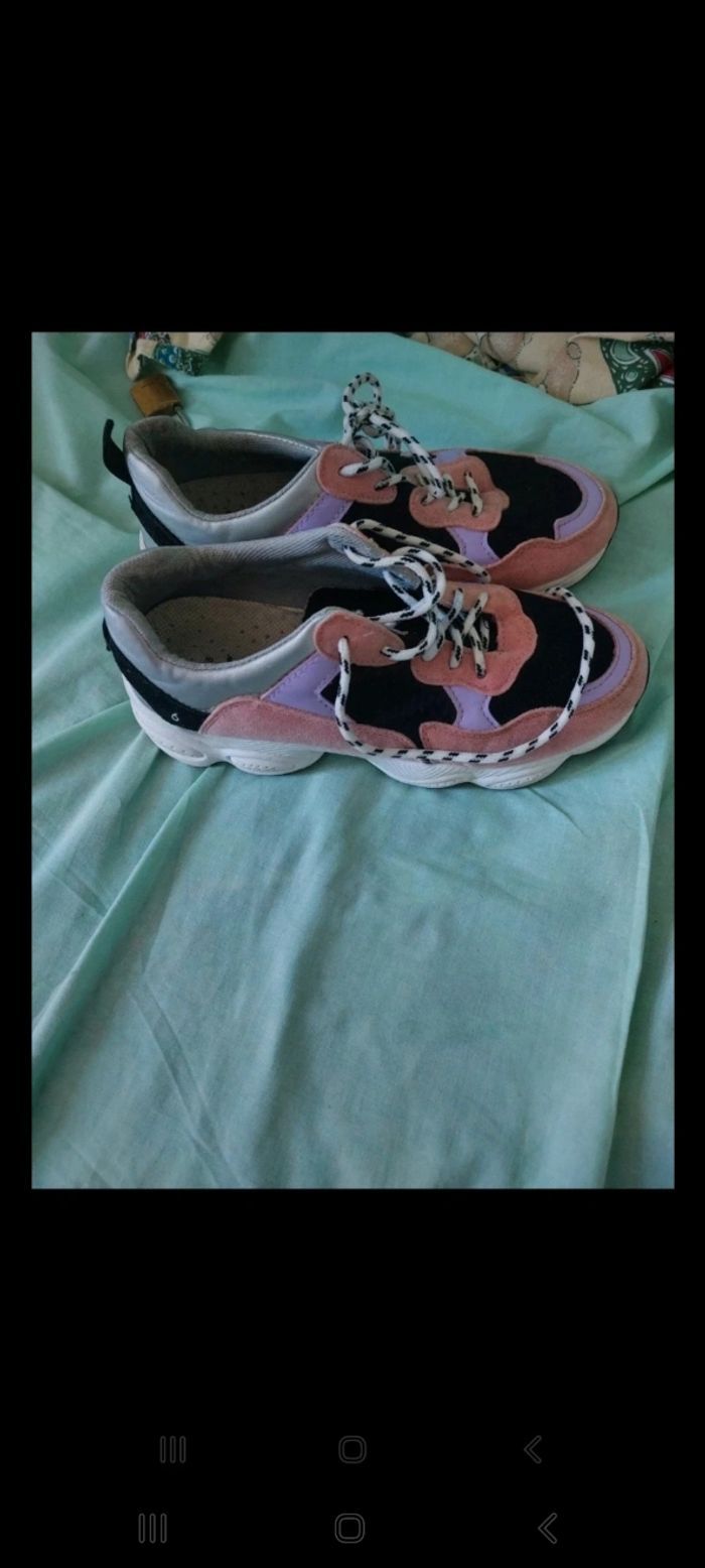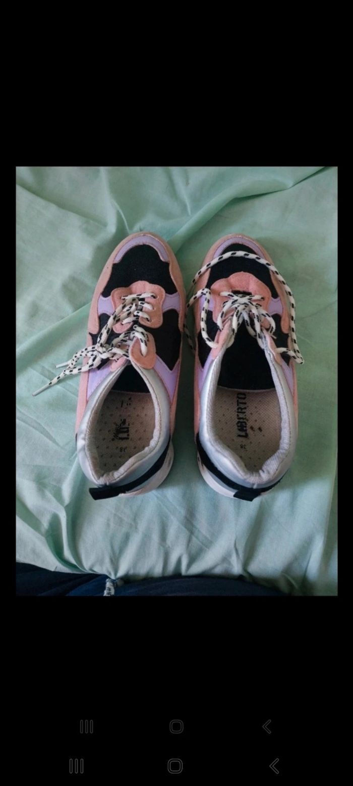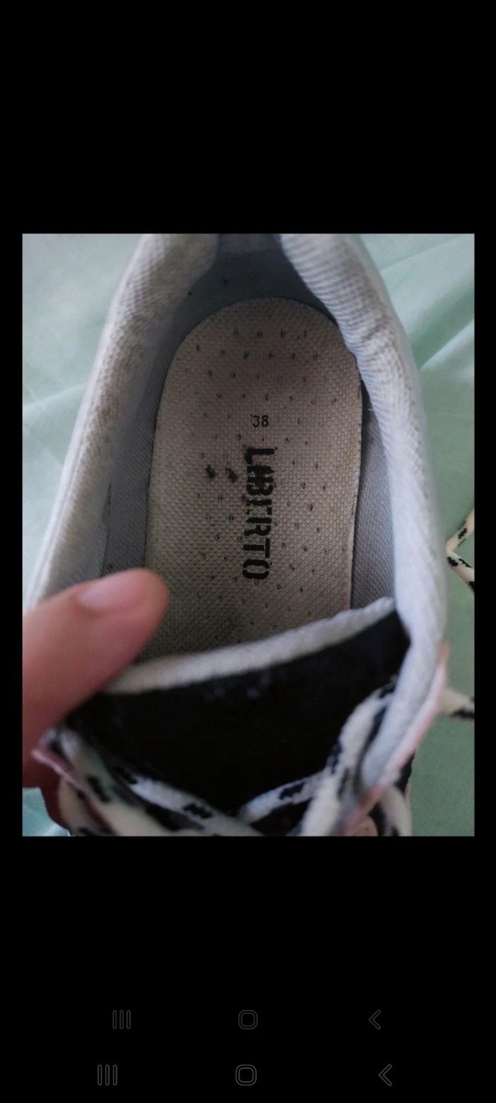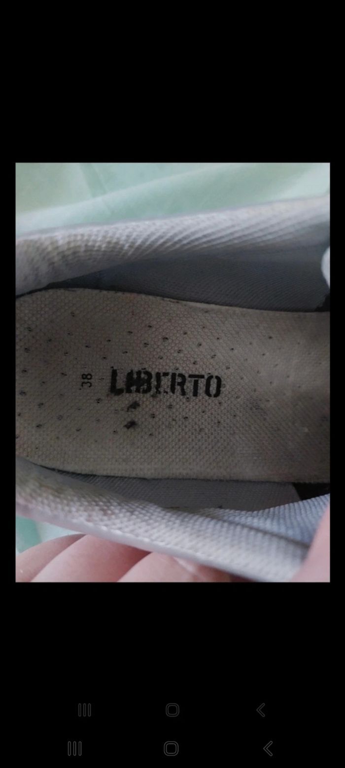 Je vends ces baskets pour femme, déjà mise mais elles sont en bon état juste en dessous des 2 paires de baskets il y a de la peinture voir un peu de morceau qui s'enlève en dessous des baskets, et la marque sur l'une des 2 paires de baskets à l'intérieur elle s'est effacé mais elles sont portables, marque Liberto, pointure 38, elles sont de couleurs multicolores