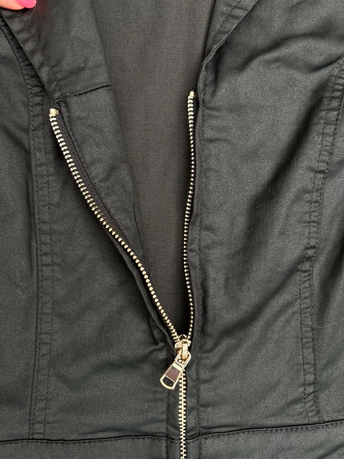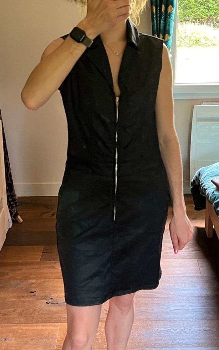Robe sans manches de couleur noire, en coton enduit souple. Fermeture éclair sur le devant. En parfait état, aucune tâche ni trou. Taille 40, marque Cache Cache. Mesure sous aisselles 49 cm Hauteur totale 94 cm Mes autres ventes ici: #femmeugolola #femme #femme40 #robe40 #cotonenduit #cotonenduitnoir #cotonenduit40 #cachecache #cachecache40