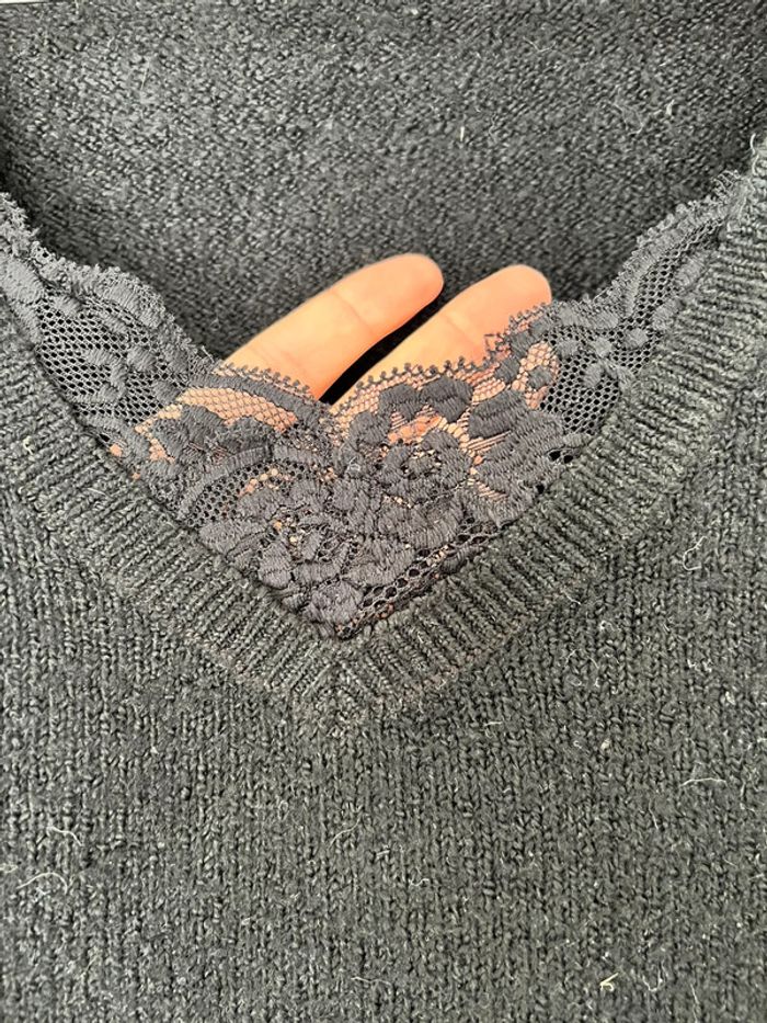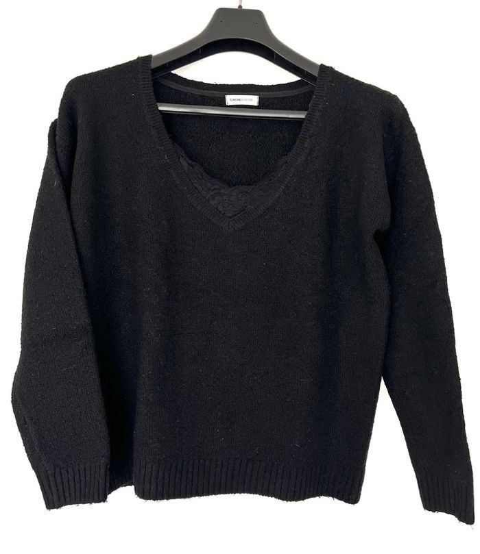 Pull de couleur noir, col en V avec dentelle. En bon état, à été porté donc présence de petites bouloches. Taille M, marque Cache Cache. Envoi rapide et soigné, réduction automatique dès 2 articles sélectionnés. Mon dressing ici: #femmeugolola #femme #cachecache #pullcachecache #pullnoirfemme #pullfemme #pullfemme38