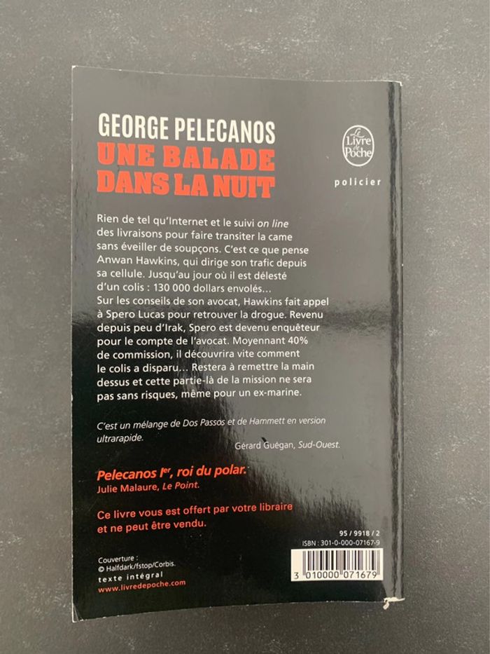 Livre de poche « Une balade dans la nuit » de Georges Pelecanos. En très bon état, seule la première page de couverture est légèrement abîmée (voir photo). Aucune page cornée. Ce Livre sera offert pour 2 livres sélectionnés dans mon dressing. Mes autres ventes ici : #livresugolola