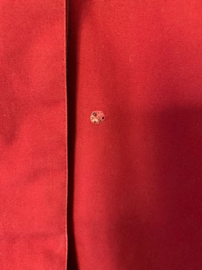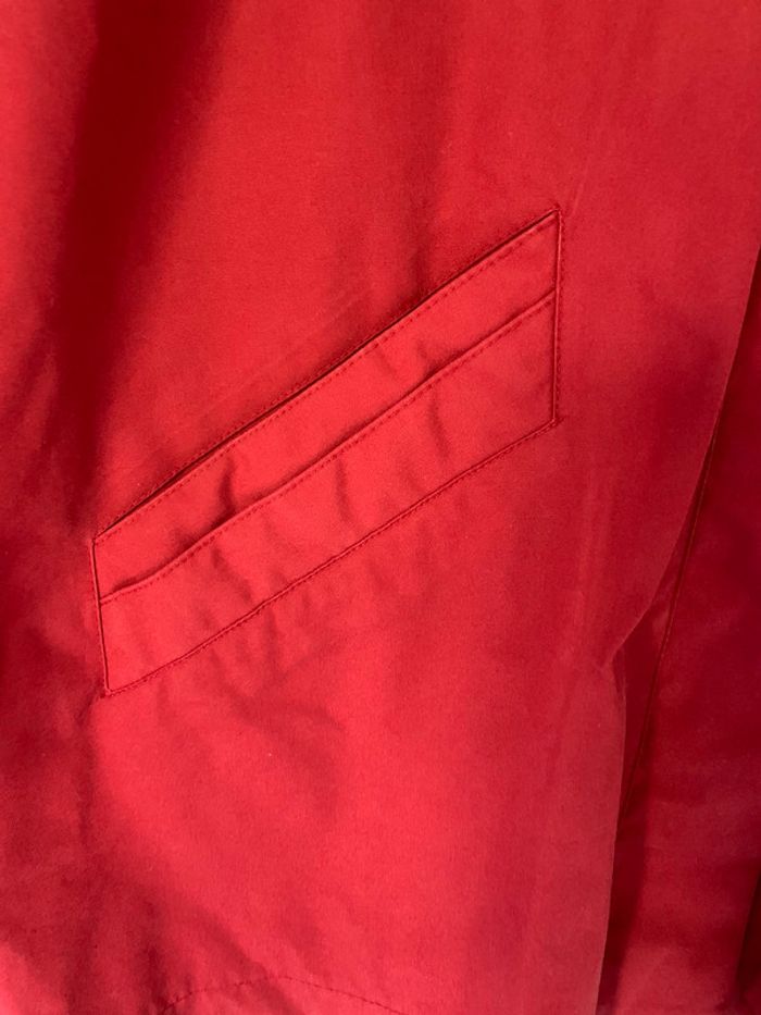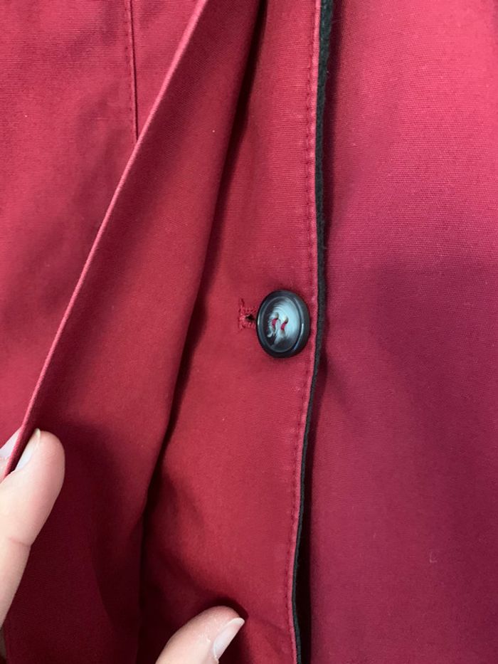 Manteau de couleur rouge, en état moyen. Présence d’une trace de brûlure sur le devant (voir photo). Présence de bouloches à l’intérieur. Taille 48, sans marque. #femmeugolola