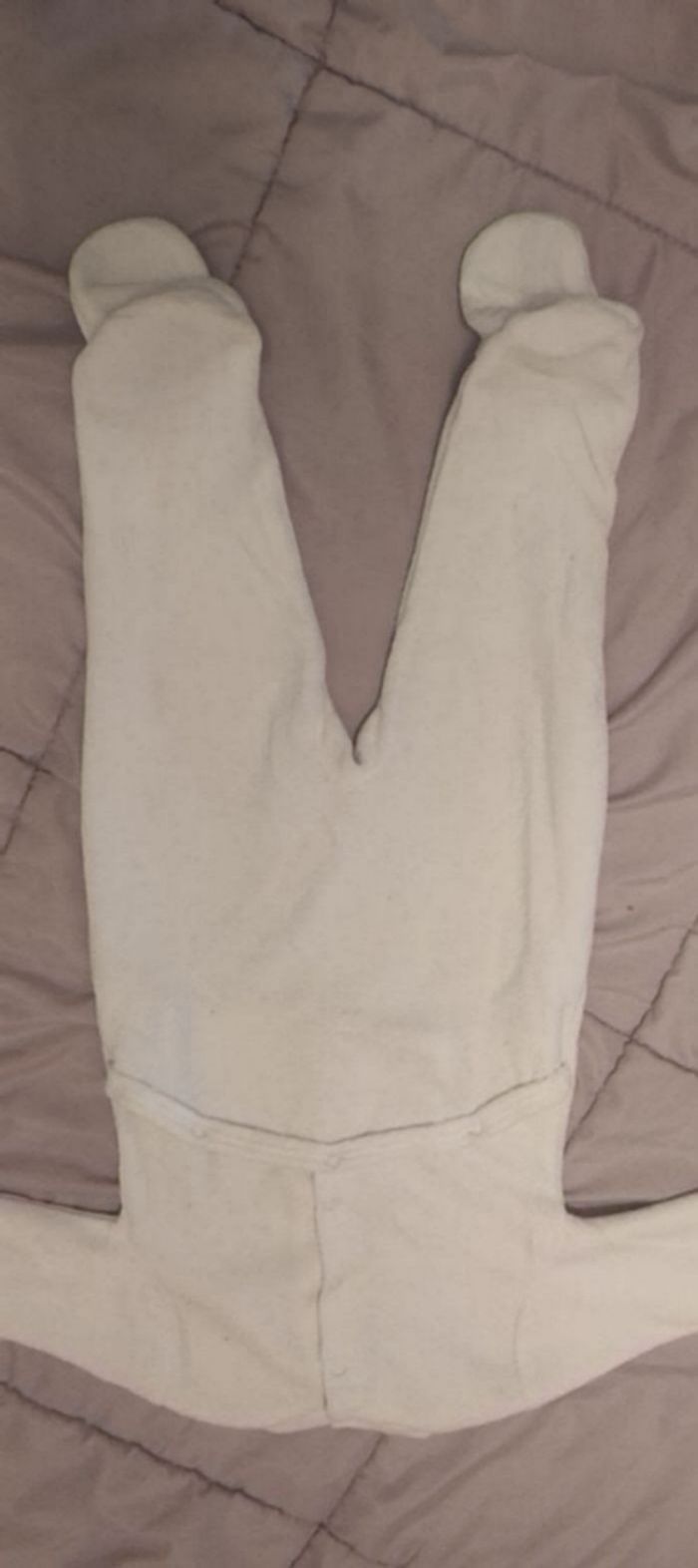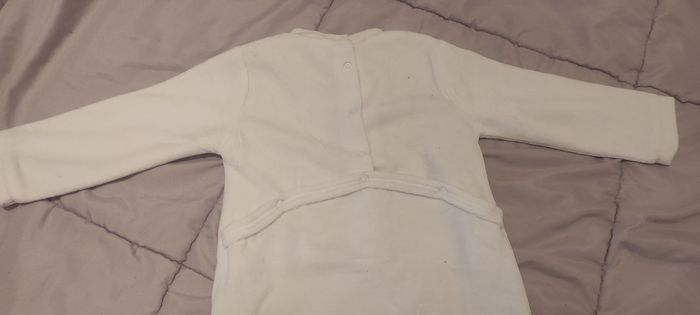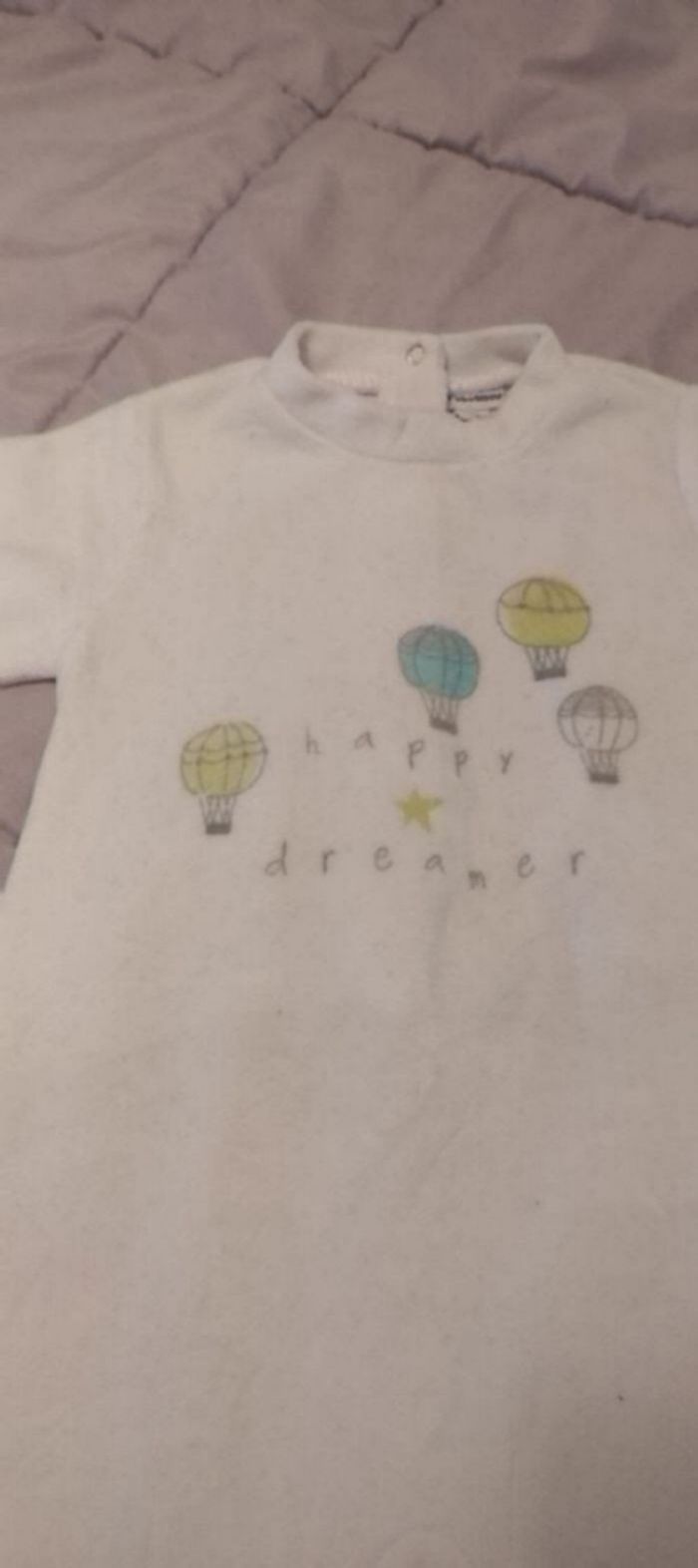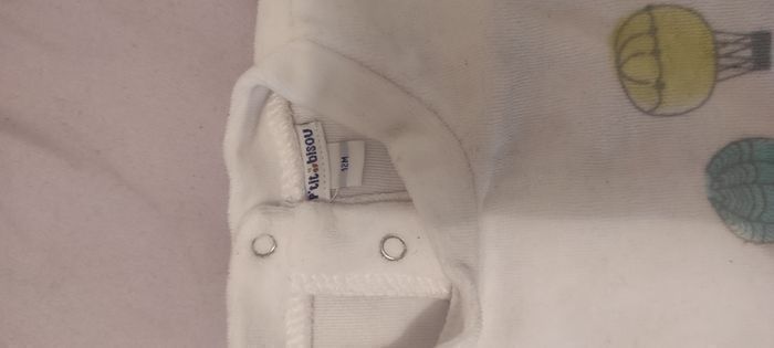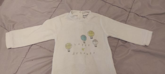 Pyjama hiver blanc P'tit bisou avec dessin de montgolfières sur le devant. Boutons pression dans le dos. Taille 12 mois, très peu porté donc en très bon état.