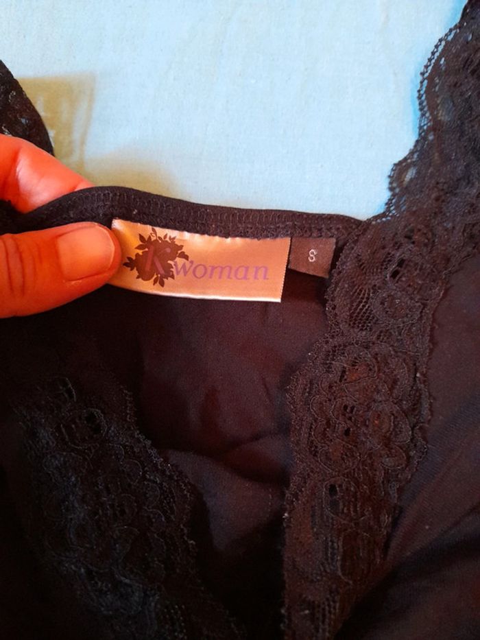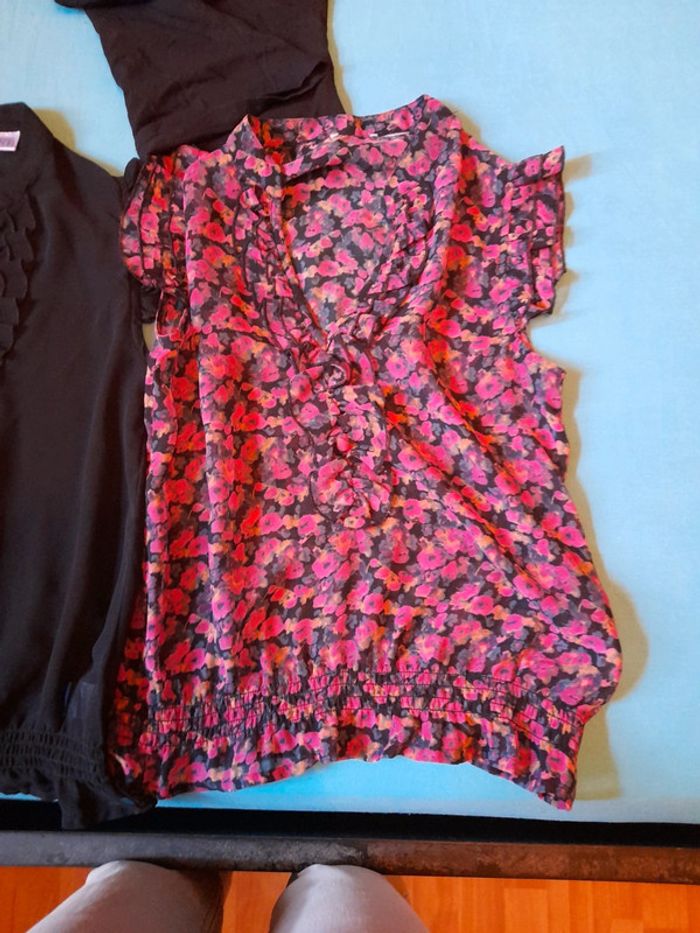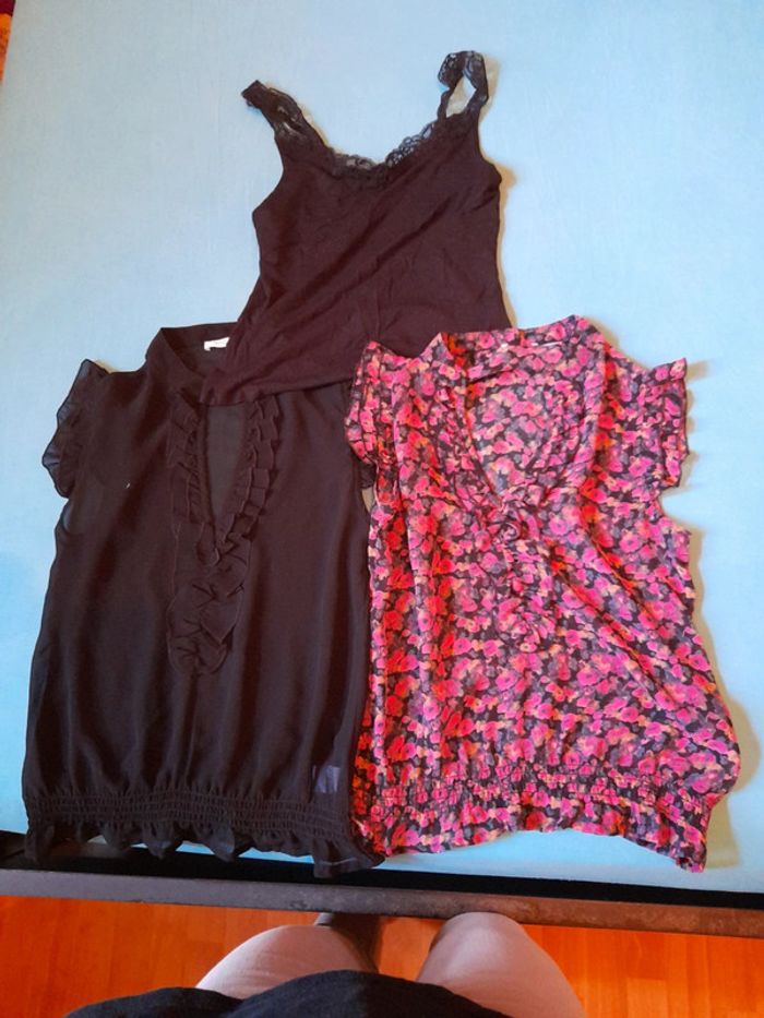 Un débardeur dentelle col et bretelle et 2 hauts voile à mettre par dessus,1 noir,et 1 fleuri ton rose