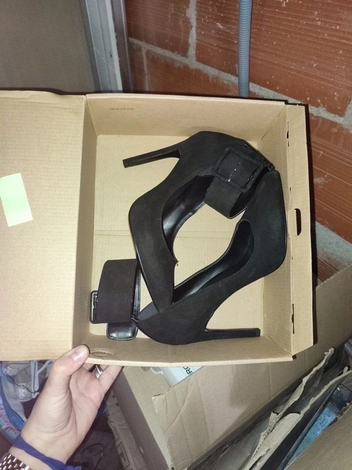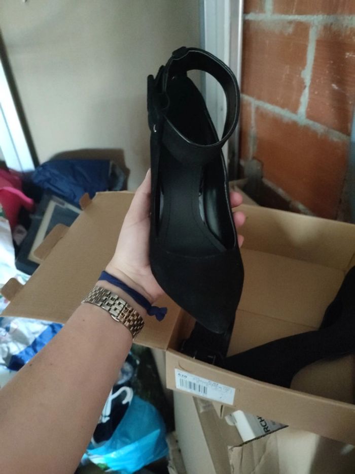 Escarpins chics en velours noirs à haut talons aiguilles avec brides réglables en fonction de la taille de sa cheville, de la marque Mango, neufs, taille 36