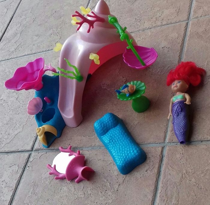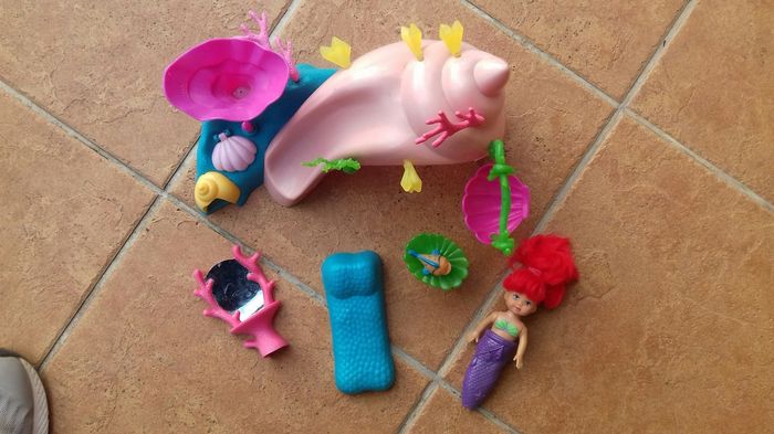 Le palais de la petite sirène contient: une "grotte" avec algues et toboggan, une balançoire, un miroir, un lit, une table, un poisson type Nemo, une petite sirène dont la queue s'enlève pour faire apparaître les jambes. Le coquillage sur le dessus de la grotte "crache de l'eau" si on le souhaite.