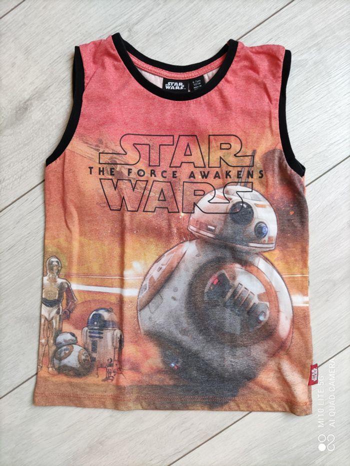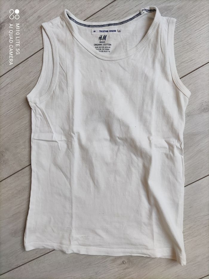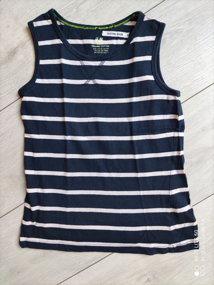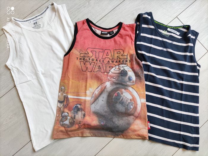 débardeur blanc uni, H&M, taille 6 / 8 ans, plutôt fin débardeur Star Wars, taille 6 / 7 ans débardeur bleu marine à rayure blanche, H&M, taille 6 / 8 ans