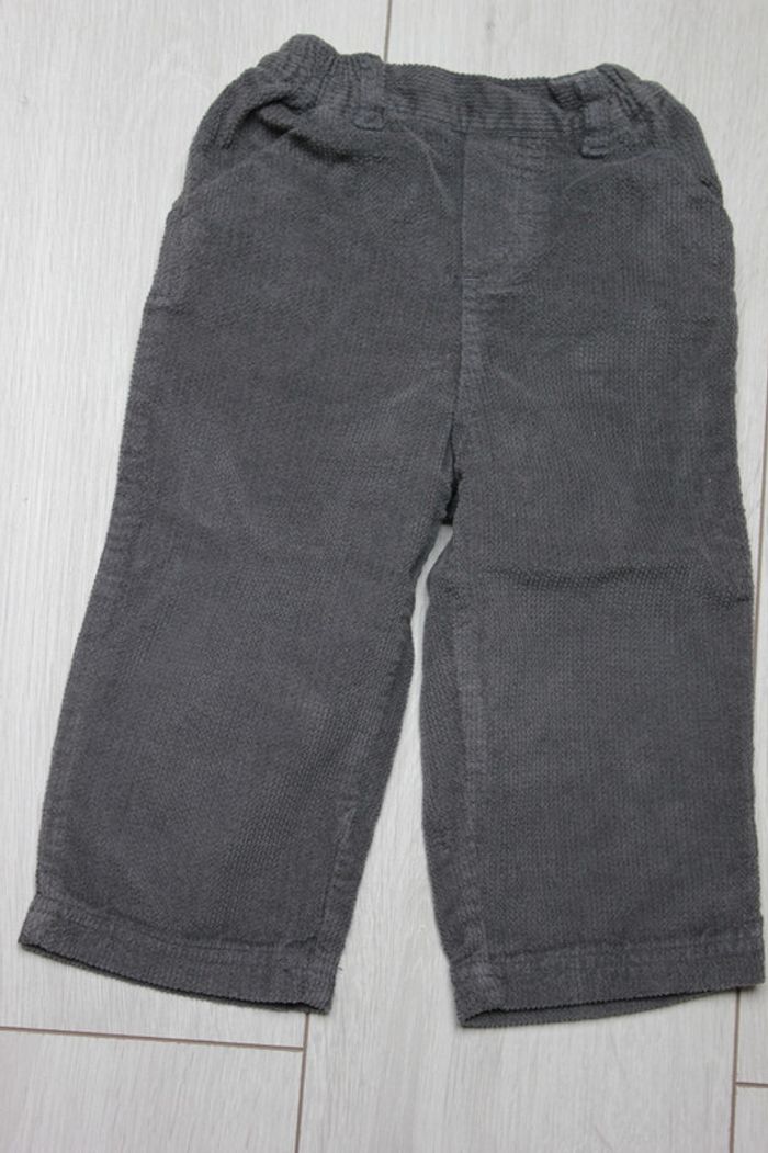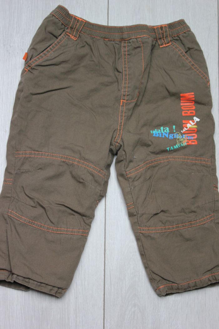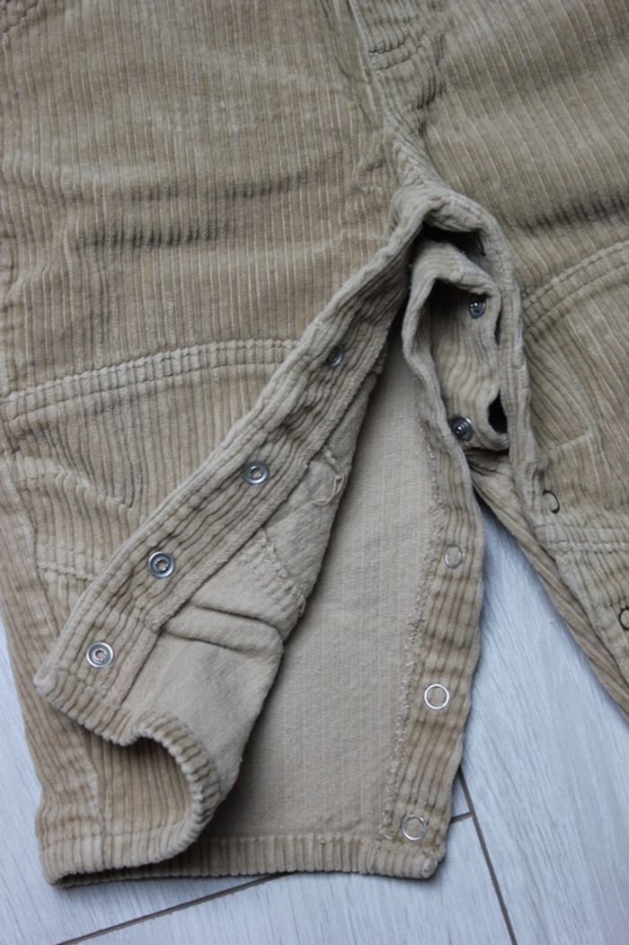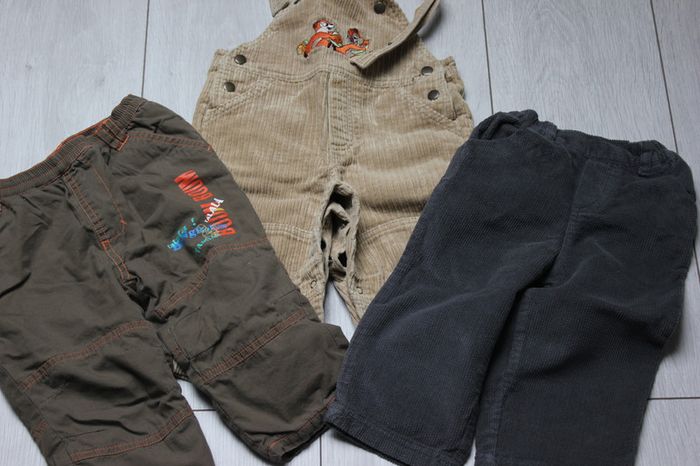 Pantalon marron, "Tissaia", doublé, taille élastique non réglable Pantalon gris, "Grain de blé", velours, taille élastique Salopette beige, "Disney", velours, boutons pressions aux entrejambes Lot plutôt hiver, ni tâches, ni trous