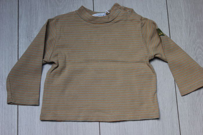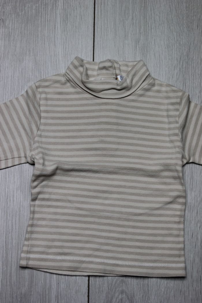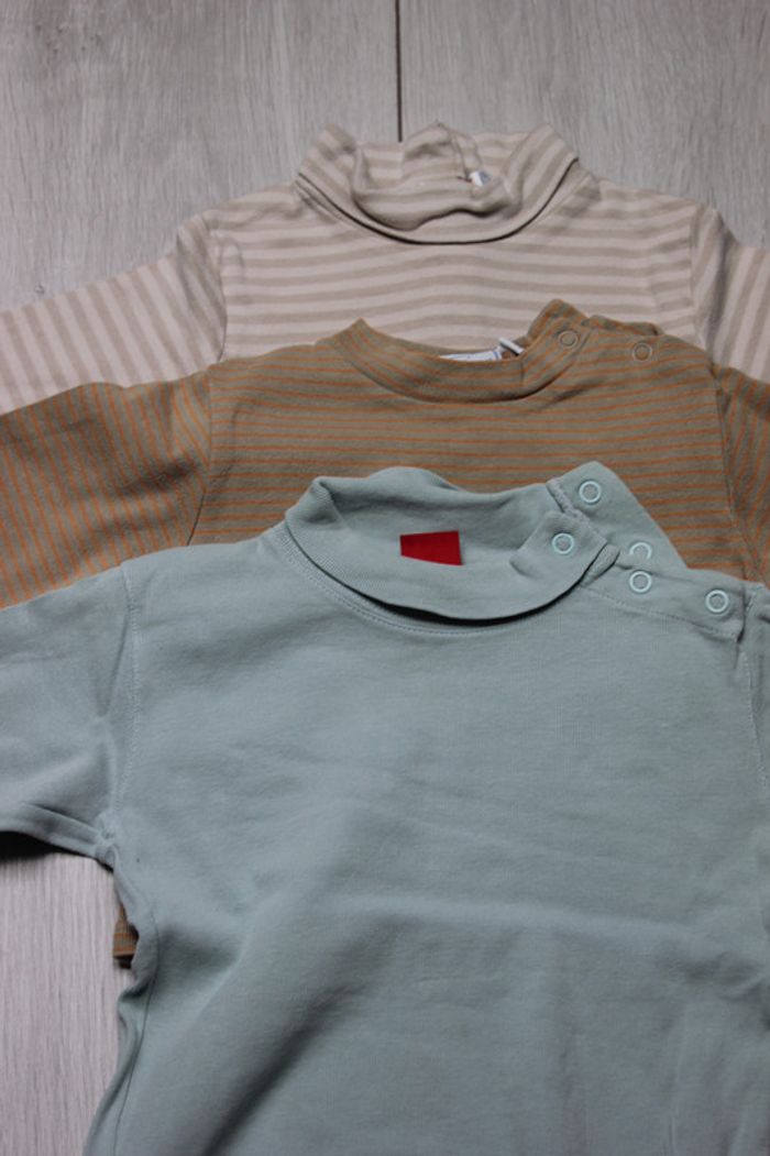 1 t-shirt à col montant, bleu vert d'eau, Tex, 3 pressions à l'épaule 1 t-shirt à col montant, beige foncé à rayures oranges, Disney, 2 pressions à l'épaule 1 t-shirt col roulé, beige à rayures beige foncé, Kitchoun, 2 pressions dans le dos
