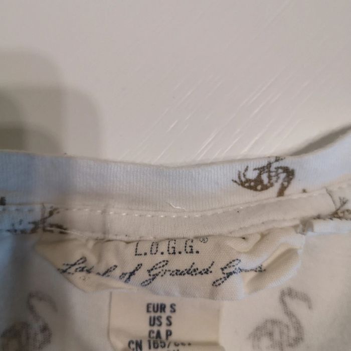 T-shirt femme, taille S, manches courtes, blanc à petits flamants dorés Très bon état #femme #fille #haut #top #tshirt #teeshirt #manchescourtes #maillot #logg #flamants