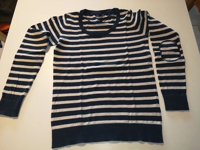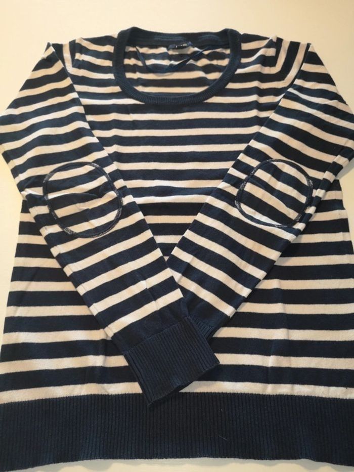 Pull, femme, taille 38, en maille, style marinière, empiècement aux coudes, col rond Très bon état #femme #fille #haut #automne #hiver #printemps #ml #pull #maille #laine #taille38 #tailleM #kiabi #marinière