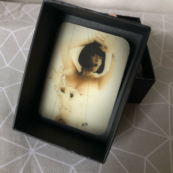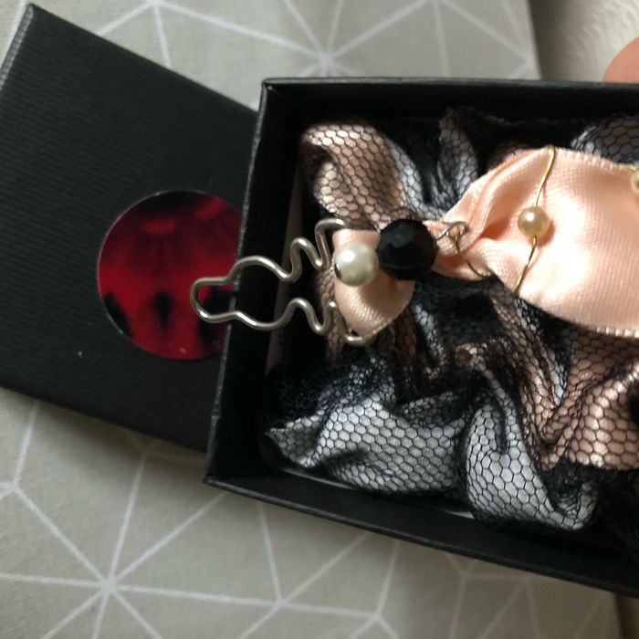 Boîte charmante intrigante dont j’ignore tout !! ruban satin perles avec jarretelle En photo de fond, Serait ce Chantal Thomas ? La boîte mesure 6,5 x 9 cm Hauteur fermée 4 cm