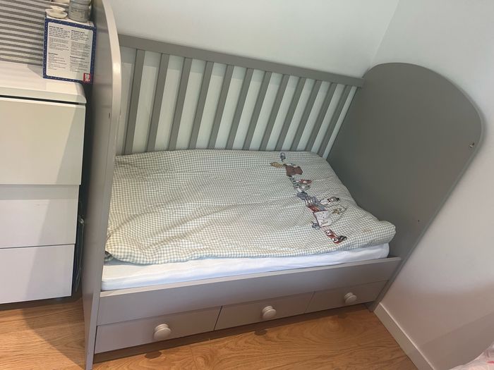 Lit à barreaux IKEA Gris clair Avec matelas Protection barrière vendu avec et barreaux 3 tiroirs Très bon etat