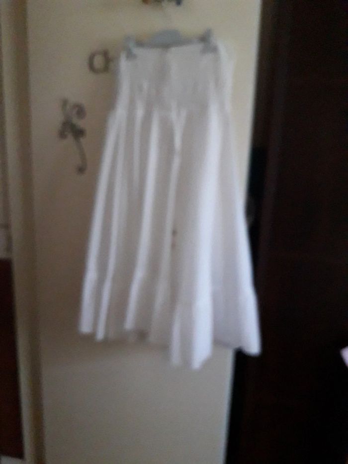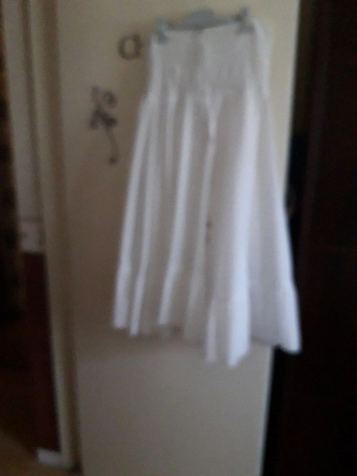 Robe blanche attache cou taille 38( sans marque ni etiquette taille), en très bon état. Elastique niveau poitrine, doublée, coton. Hauteur 87 cm