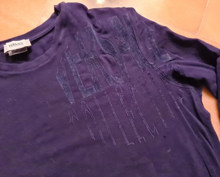 T-shirt manche longue homme Marque Versace Taille XL Couleur bleu marine Bon état, tache sur manche gauche et un petit fil tiré sous le logo voir photos