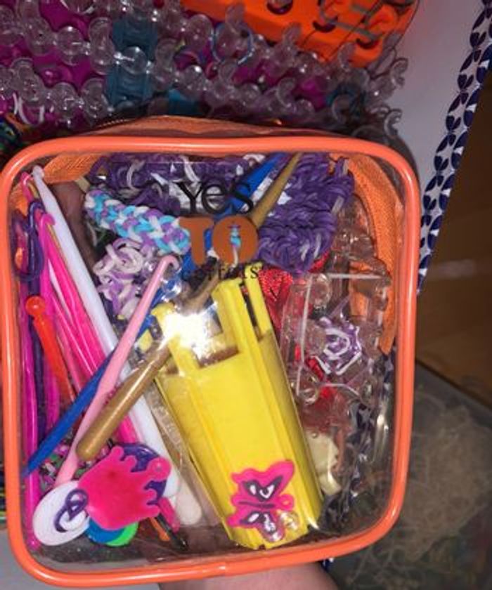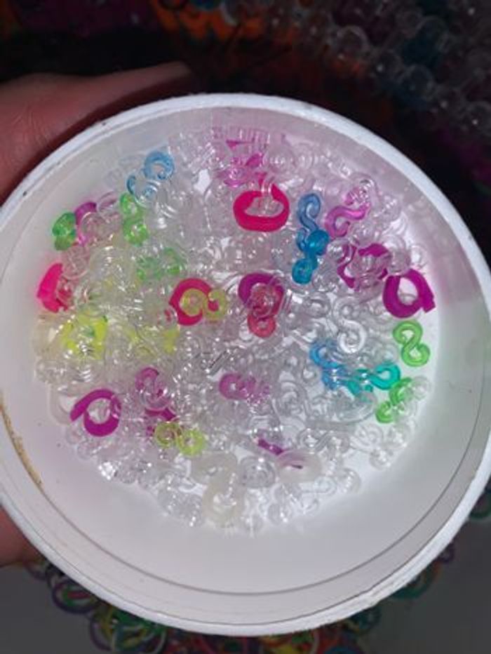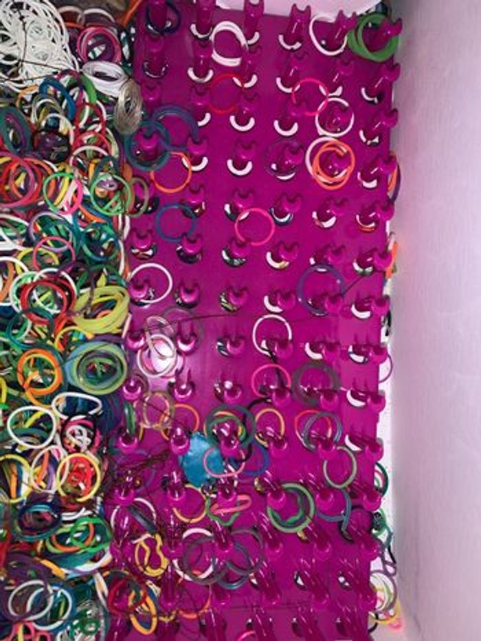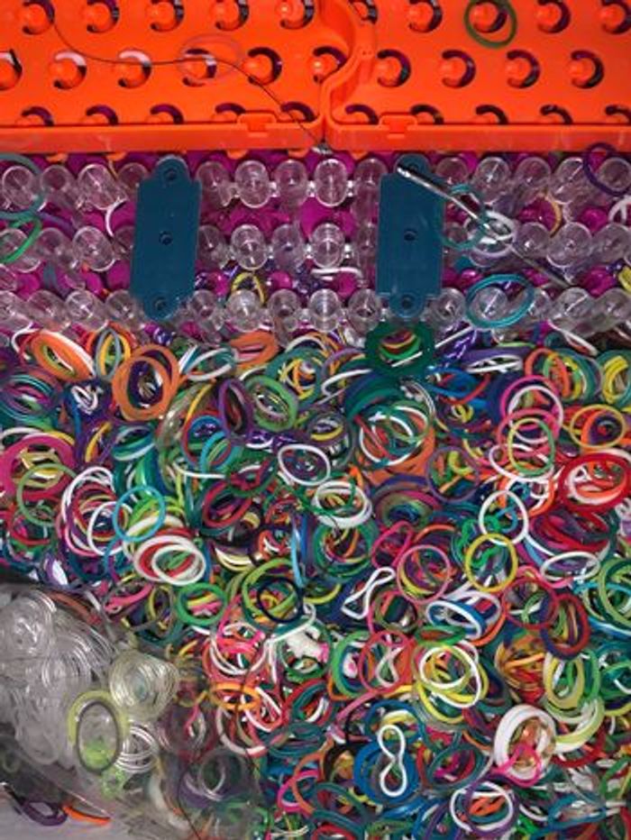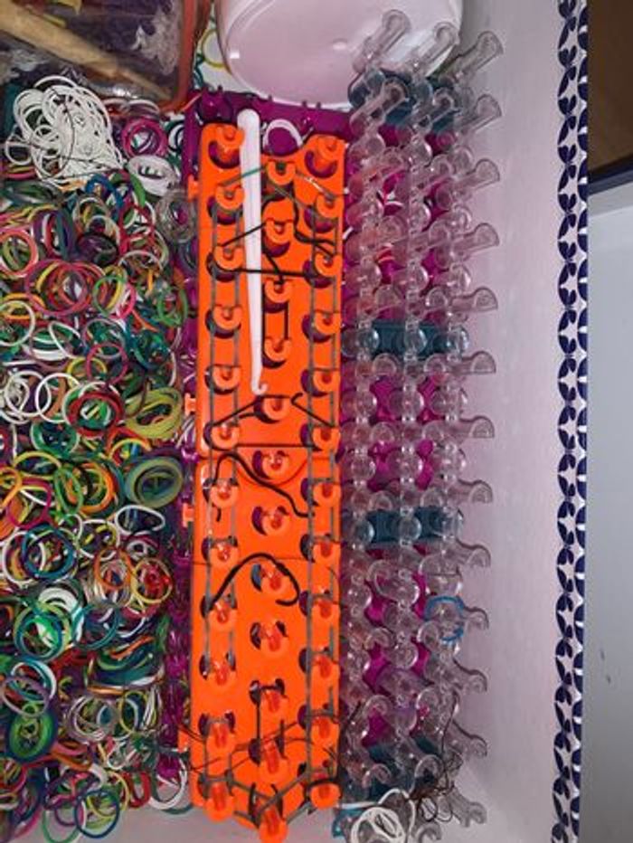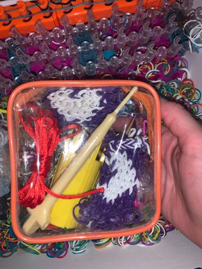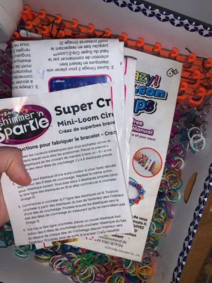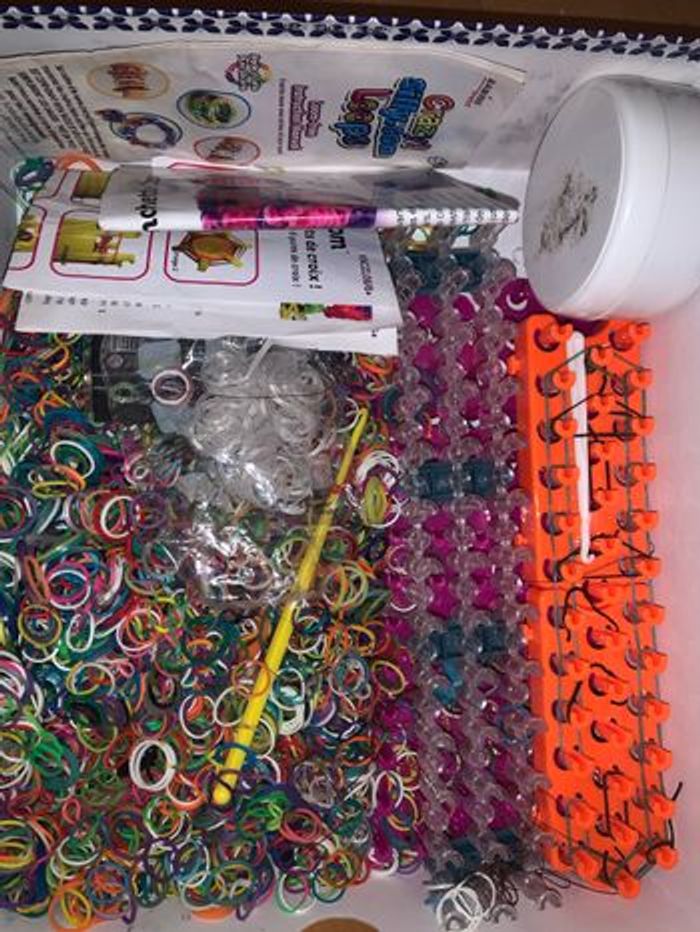 Une boîte qui contient - Des centaines d’élastiques multicolores - Une dizaine de crochets - Une boîte de fermoirs - 3 barres de crochets - Des modes d’emplois - Des petits charms/fils - Des créations déjà réalisées