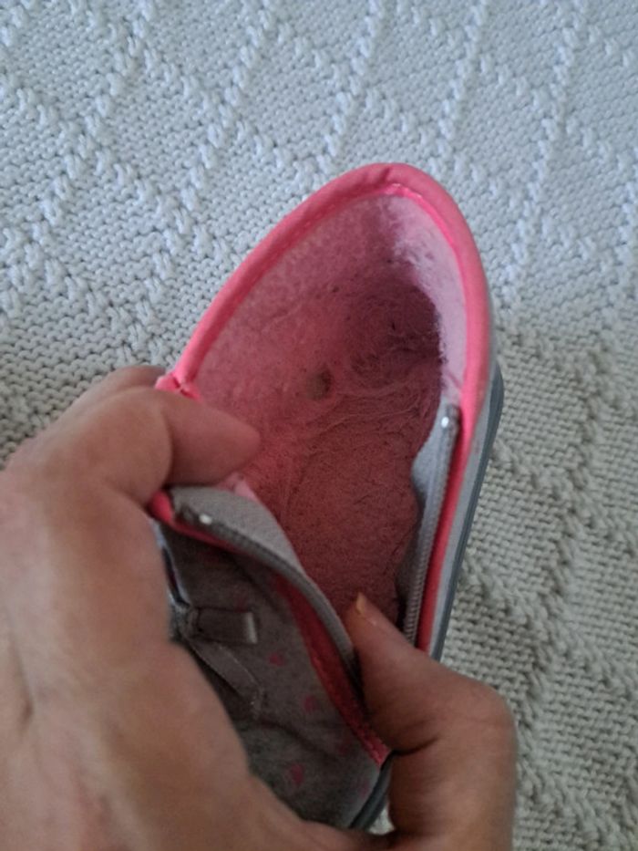 Vends chaussons zippés gris et cœurs roses 🌸 Pointure 22 🌸 TOOTI 🌸 Bon état (intérieur légèrement usé avec frottement du pied voir photos) #chabarre27_fille_chaussons #chaussons #pointure22 #gris #rose