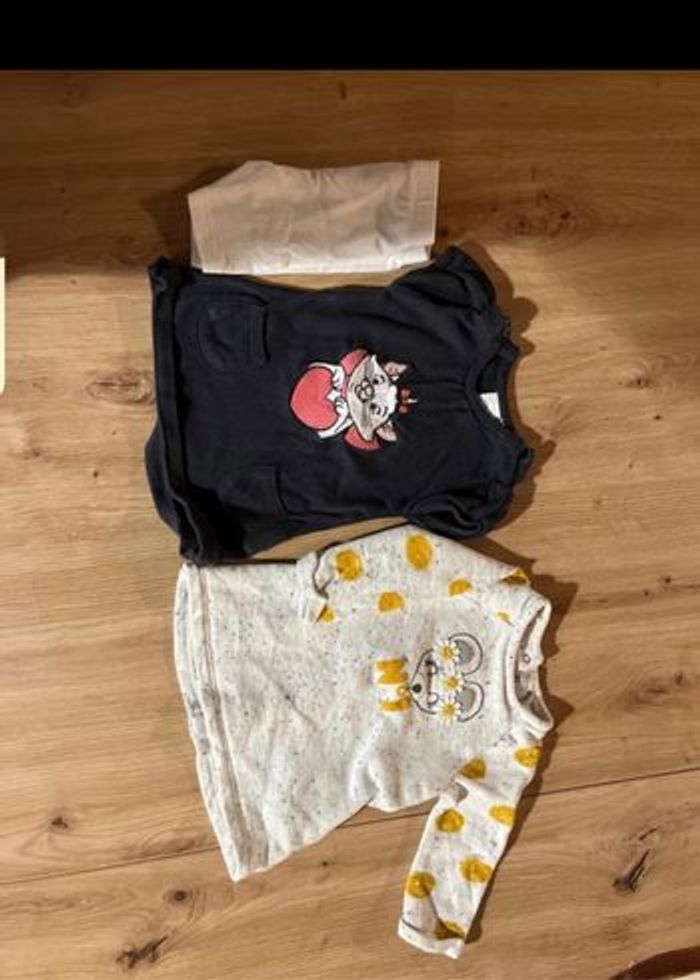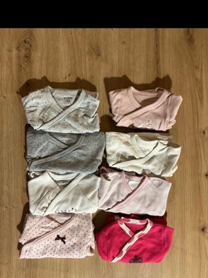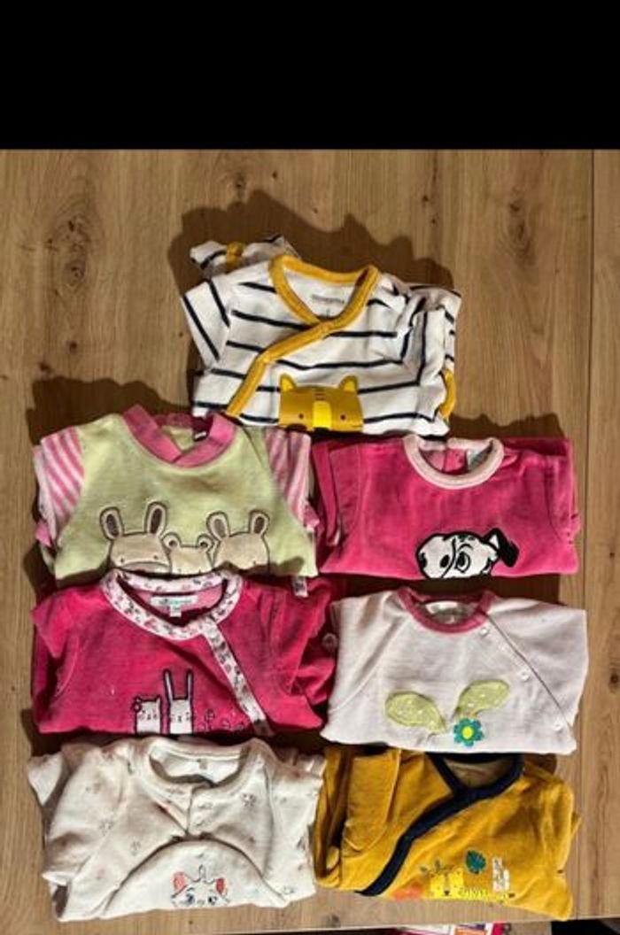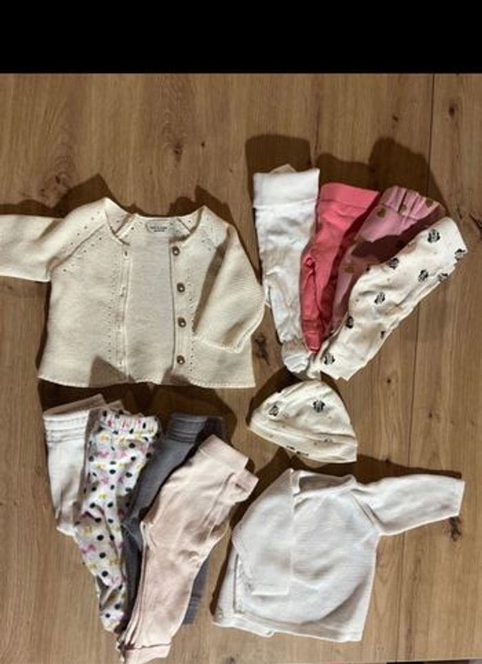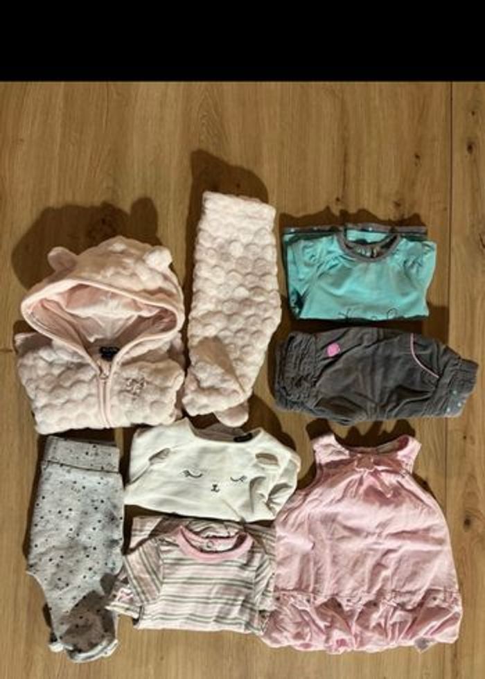 Lot fille 1 mois 7 pyjamas 2 vestes 5 ensembles hauts + pantalons 3 ensembles /robes 8 body 8 pantalons 2 gilet 1 bonnet Du Tao, Kiabi, Orchestra…
