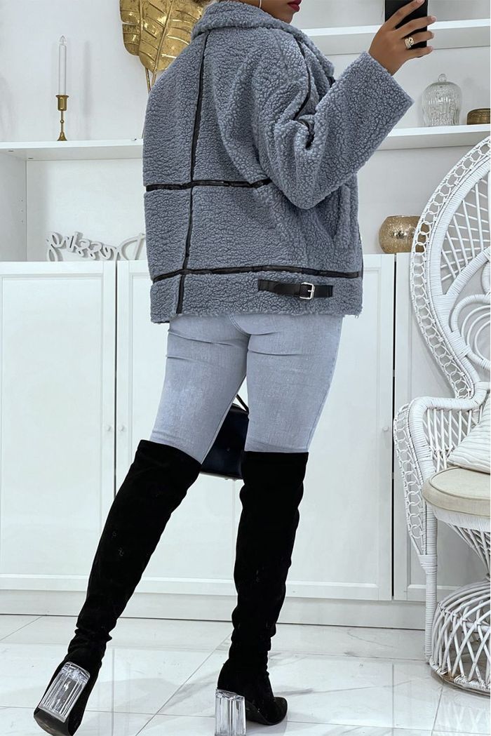 Manteaux gris style aviateur en moumoute avec jolies bandes simili cuir chaud et doux Taille M et L 100% Polyester