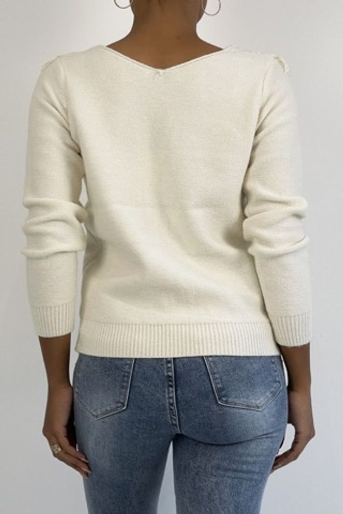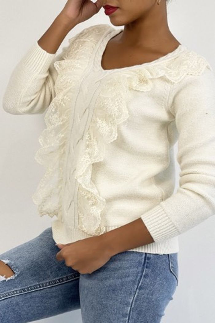 Pull col V très chic beige à volants. Pull classique, idéale avec un jeans pour un look casual chic ou avec une jupe crayon pour un look hyper élégant. Taille unique du 36 au 40 Composition : 52% acrylique 28% polyamide 20% polyester