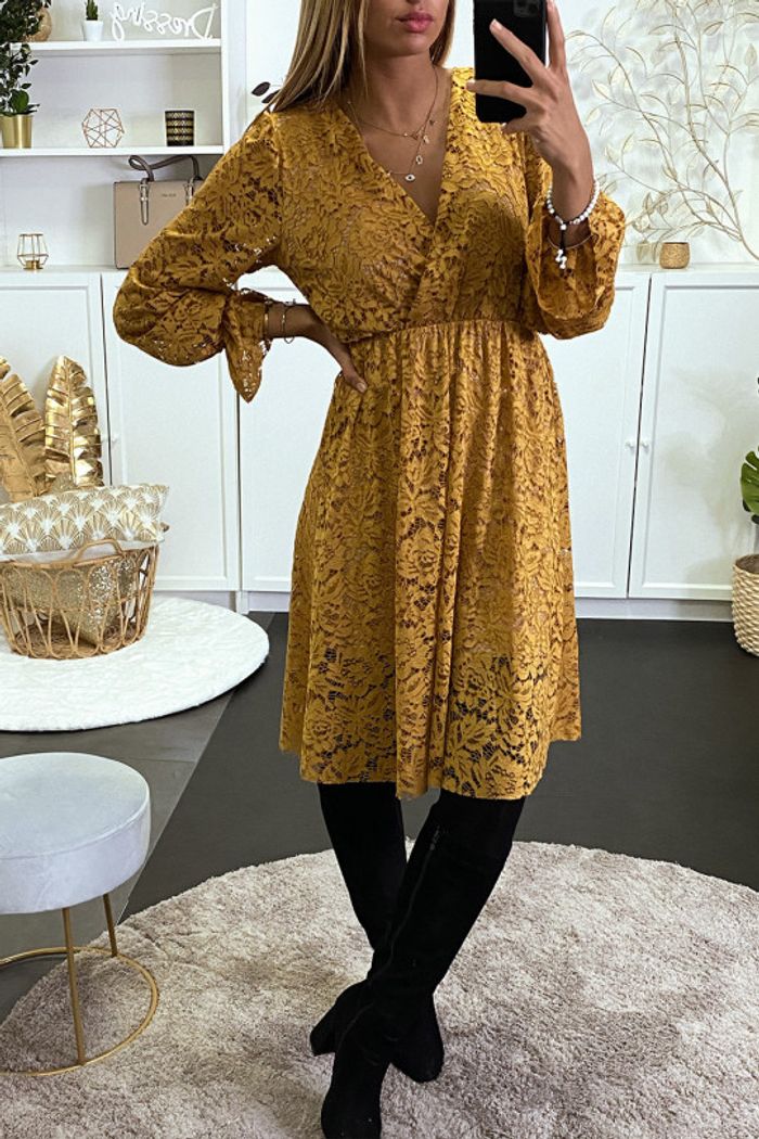 Robe moutarde à dentelle coupe évasée. Taille S 90% Polyester 10% Élasthane