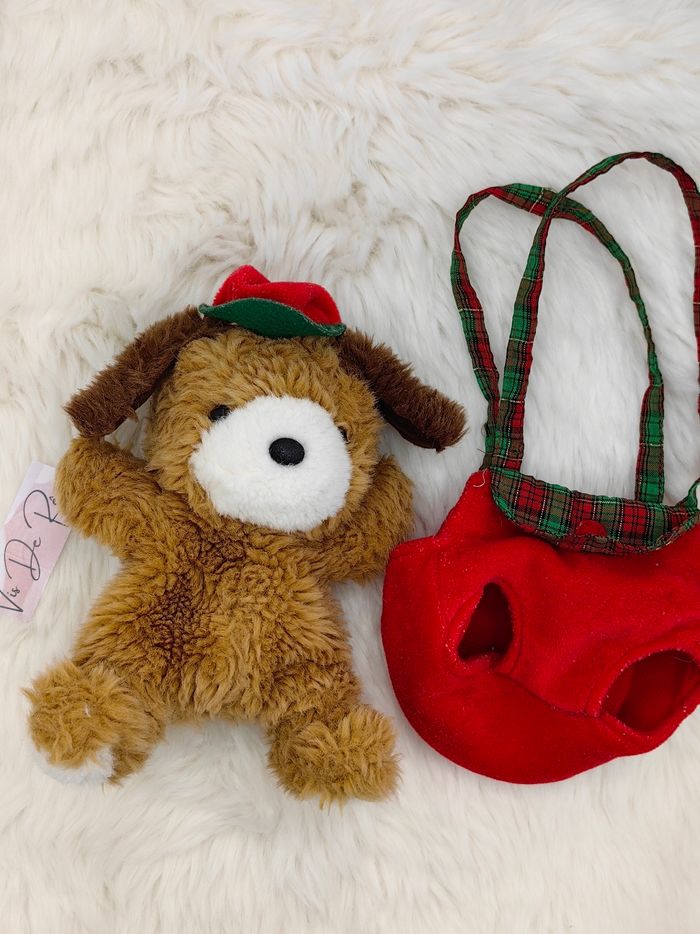 Peluche chien marron et blanc casquette, dans sac rouge et vert Noël  Vintage - photo numéro 1