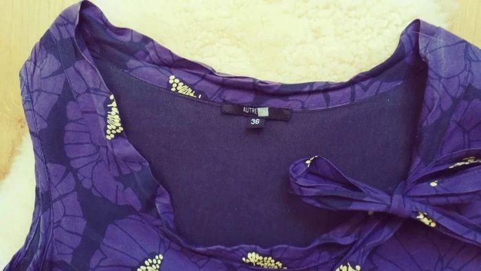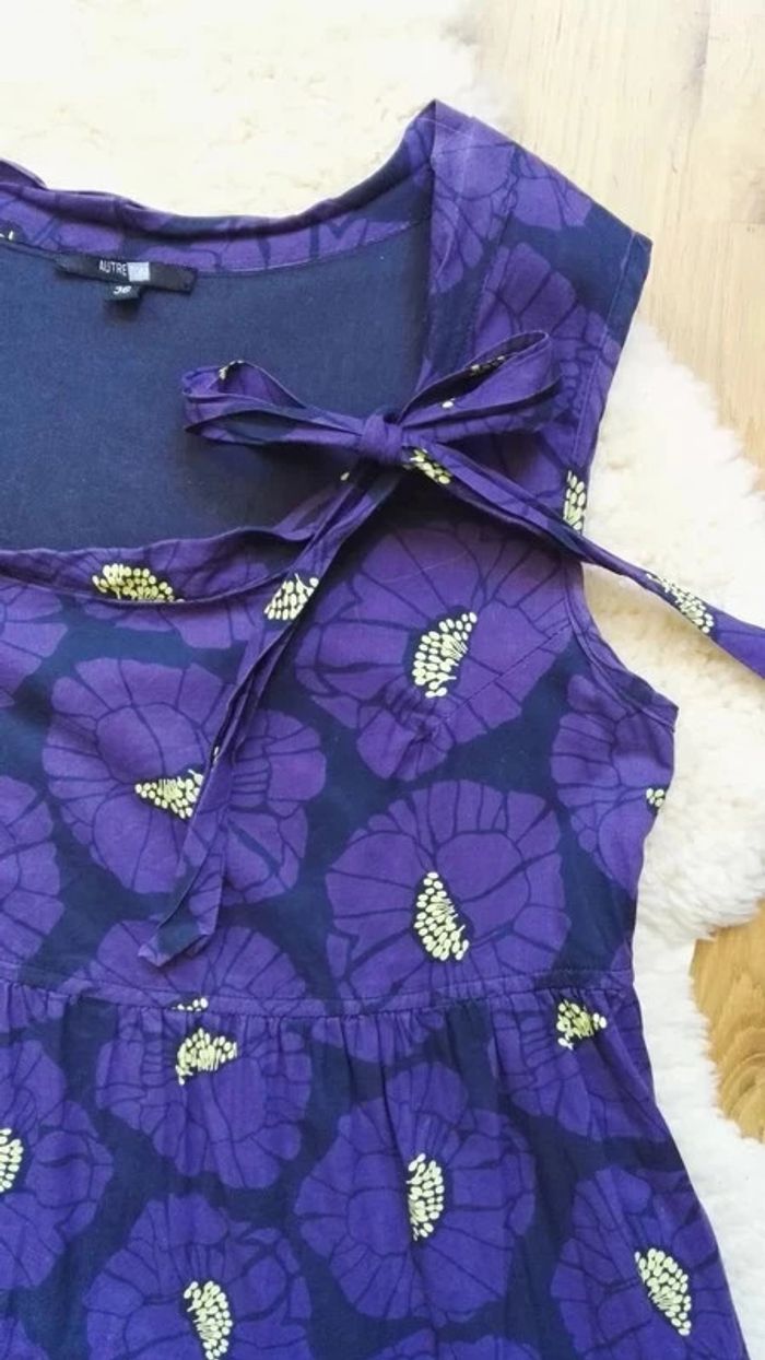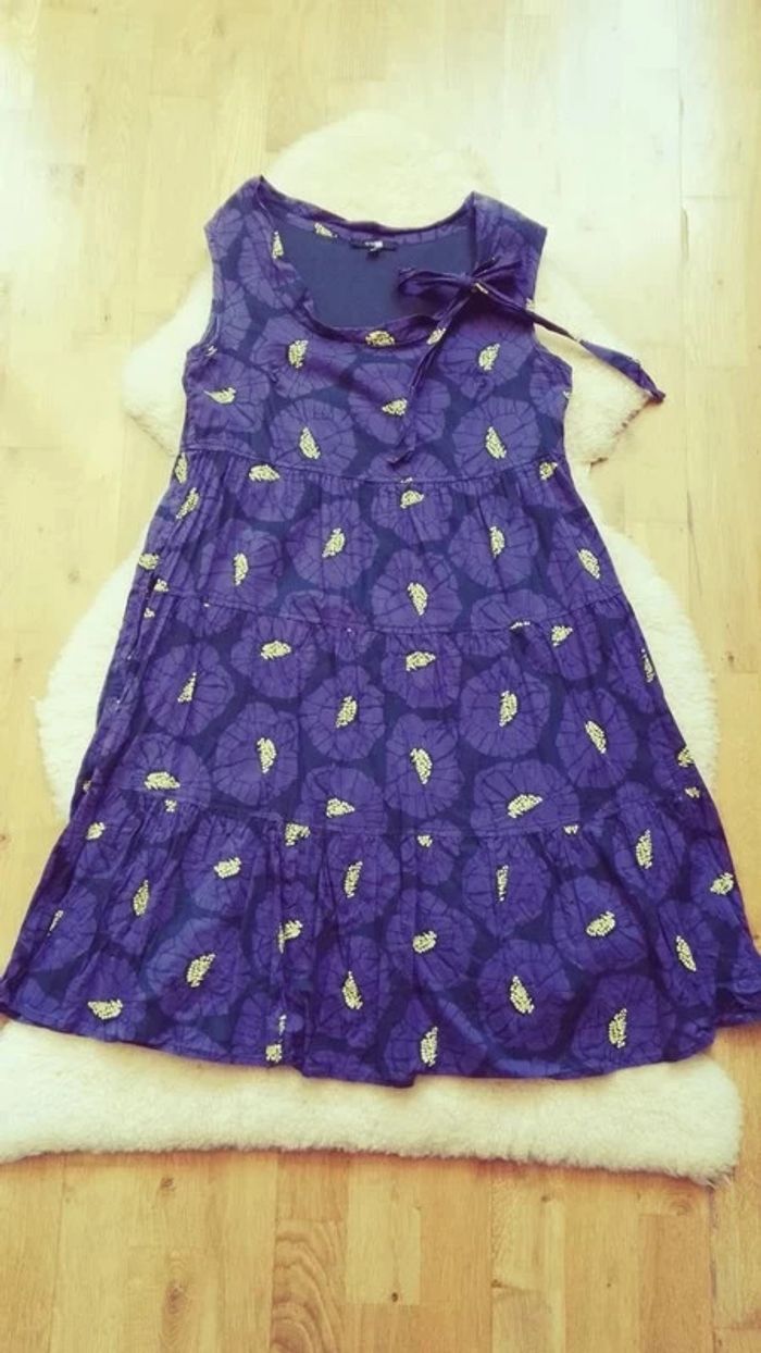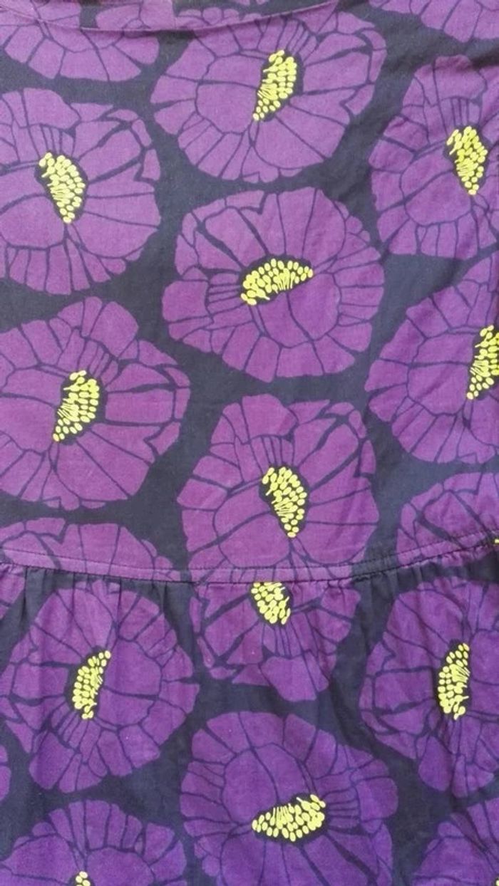 Robe violette motif à fleur et pistil jaune, Bonne couleur = photo 2 forme trapèze évasée inspiration japonaise, Marque " Autre ton " de chez Monoprix, robe doublée, 100 % coton, petit #nœud à faire et défaire au niveau du #décolleté, décolleté rond et chic 2 poches latérales cachée au niveau jupe, taille 36 été #S36femmeEd3 #verano #summer #fleur #pistil #vegetal #été #maman #futur #bebe #maternité #floral #asi #japon
