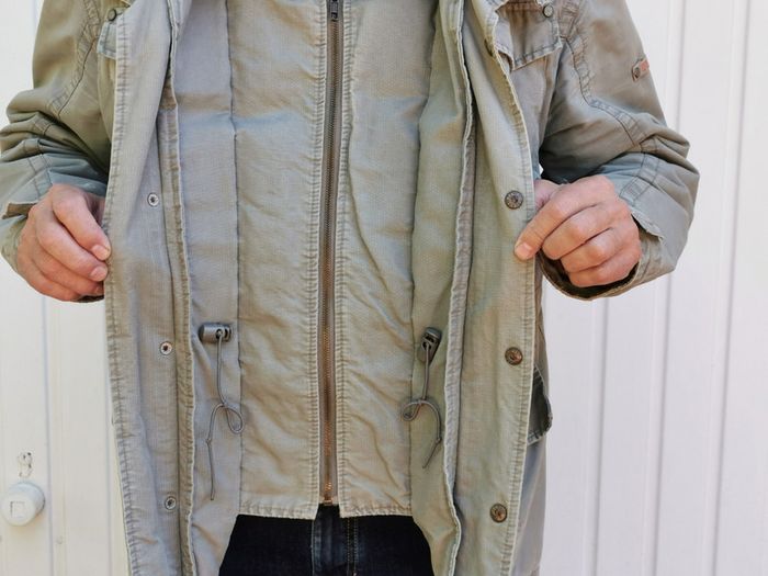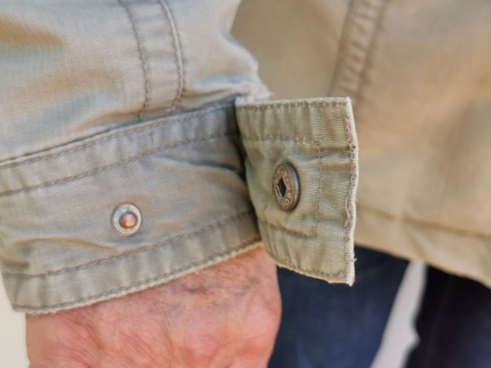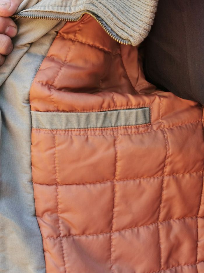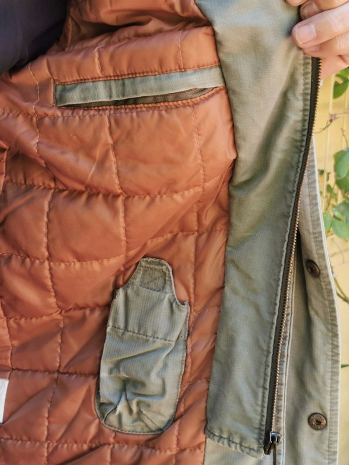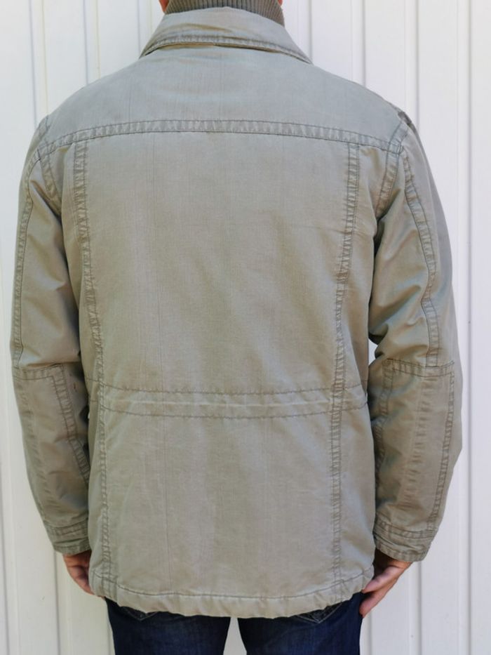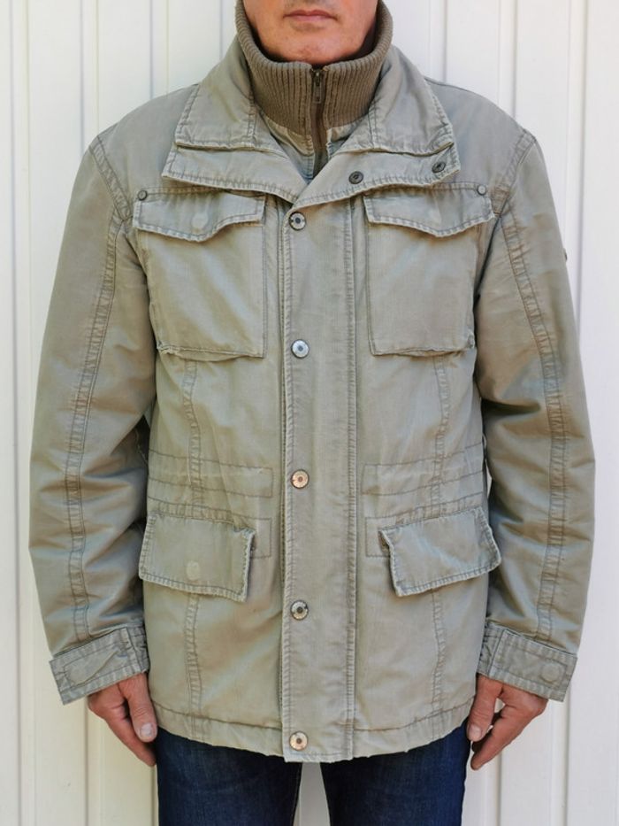 Blouson veste manteau vert clair Grand S qui correspond à un M muti poches : 4 extérieures 2 intérieures + 1 poche spéciale longue à scratch article fermé par fermeture éclair + rabat avec boutons lien de serrage à l'intérieur pour la taille double col montant matelassé doublé chaude style " used " pour le look car c'est Creeks ! #MhommeEd3 #printemps #automne #spring #automn #fall #spring #veste #blazer #hiver #winter